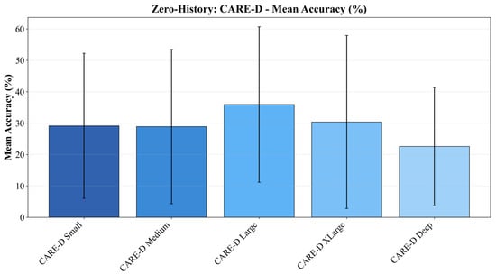 Figure 2 and Figure 3 summarize how the three CARE-D architectures behave in zero-history and few-history conditions. In the zero-history setting (k = 0), shown in Figure 2, the models must predict execution time in previously unseen hardware–software environments without any calibration samples. Under this challenging condition, CARE-D achieves an accuracy between approximately 28% and 36% within the 10% relative error band, and the performance varies noticeably with architectural capacity.