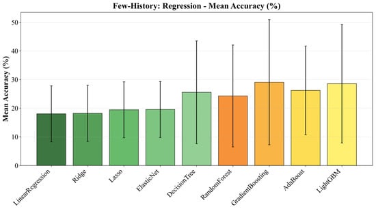 Figure 6 summarizes the behavior of classical regression models, including linear, tree-based, and kernel-based regressors, when few-history calibration is applied. In contrast to CARE-D, these models show almost no meaningful accuracy gain: the observed changes remain within a very narrow band of roughly 0.01–0.02 percentage points across different values of , and in some environments, the calibrated models even exhibit a slightly worse accuracy than their zero-history baselines. A closer inspection of the top-performing regressors (Gradient Boosting, Random Forest, XGBoost, SVR, and LightGBM) confirms this trend. Small positive changes occasionally appear, but they are rare and typically accompanied by degradation in MAE or , so the overall fit to the runtime distribution does not improve.