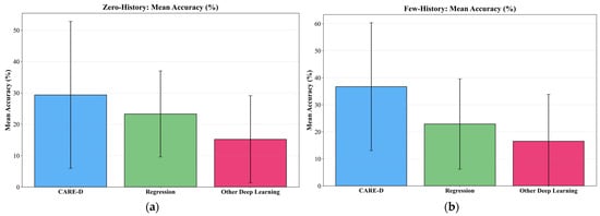 Figure 8 shows the average performance of the three model families—CARE-D, classical regression models, and other deep learning baselines—under zero-history and few-history conditions. In the zero-history setting, as shown in Figure 8a, CARE-D already provides the best-performing cross-environment generalization among all evaluated methods. Its average accuracy is several percentage points higher than the best ensemble regression models, consistent with the overall result that CARE-D achieves a baseline accuracy about 6.06 percentage points higher than the best regression baseline. Regression models form a stable but lower-performing group, while the other deep learning models (LSTM, GNN, and Transformer) remain clearly below CARE-D, and in some cases, close to random prediction, reflecting their misaligned inductive biases for execution-time prediction.