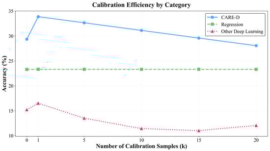 Overall, Figure 8 highlights that few-history information is model-dependent in this setting. CARE-D is the only family that consistently converts 1–5 calibration samples into accuracy and MAE improvements, whereas regression and other deep learning models remain largely unchanged or even deteriorate. This pattern supports the claim that CARE-D is specifically well-suited for few-shot adaptation in heterogeneous physical AI environments, while conventional regressors and generic deep architectures cannot effectively exploit the same limited calibration budget.