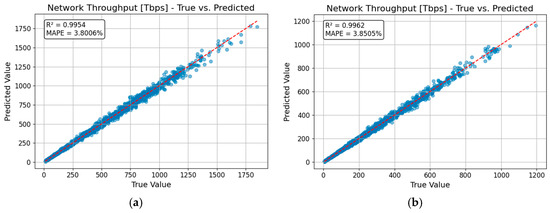 Predicted versus true values for network throughput. (a) Gaussian modulation; (b) Practical modulation.