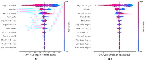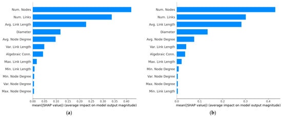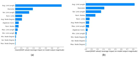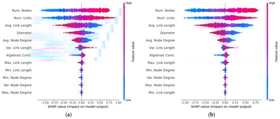 The SHAP bar plot in Figure 2a reveals that the seven most influential features for predicting network throughput are: number of nodes (N), number of links (L), average link length , network diameter (), average node degree , variance of the link length , and algebraic connectivity . On the other hand, the beeswarm plot, in Figure 3a, further shows that throughput increases with larger values of N, L, and , while the opposite trend is observed for , and ; that is, throughput decreases as these features increase. Notably, the trends reported for N, L and are consistent with the findings in [7], [9] and [11], respectively, while the trend for agrees with the results in [10]. The trends for and are also consistent with the results reported in [11].
