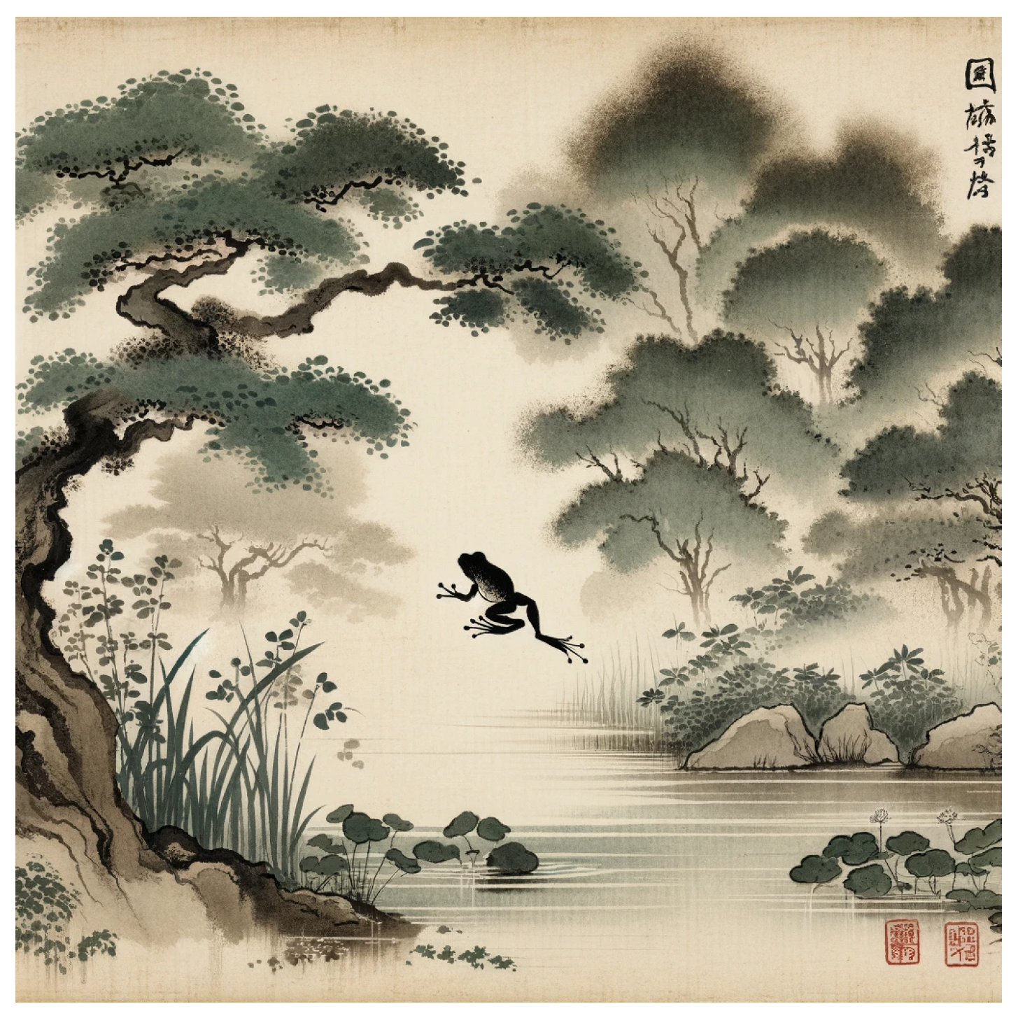 Example image generated by DALL·E for the haiku (English translation), “An old pond, a frog jumps in, the sound of water.” The visual output successfully captures the poem’s tranquil and introspective atmosphere.