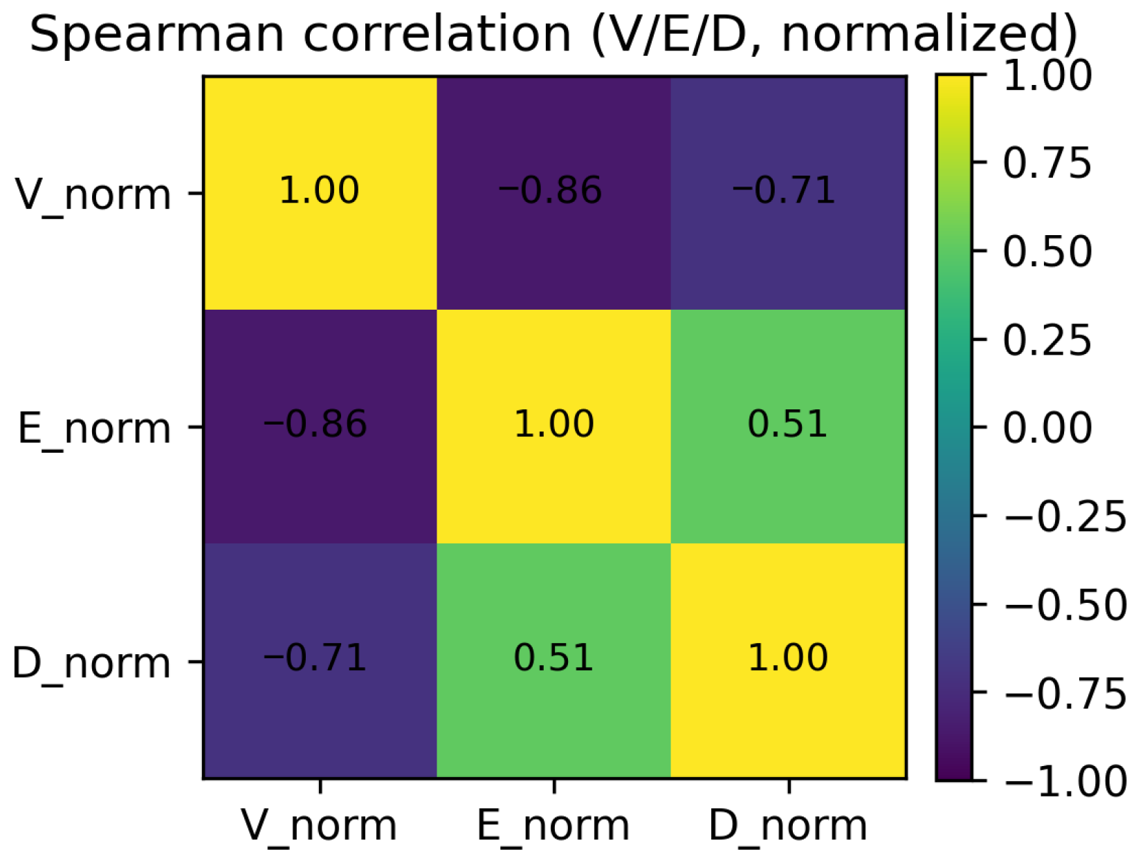 Spearman correlation heatmap among normalized Valence, Energy, and Dynamism features. Valence is strongly negatively correlated with Energy and Dynamism, while Energy and Dynamism are moderately positively correlated, indicating a structured and interpretable affective space rather than independent dimensions.