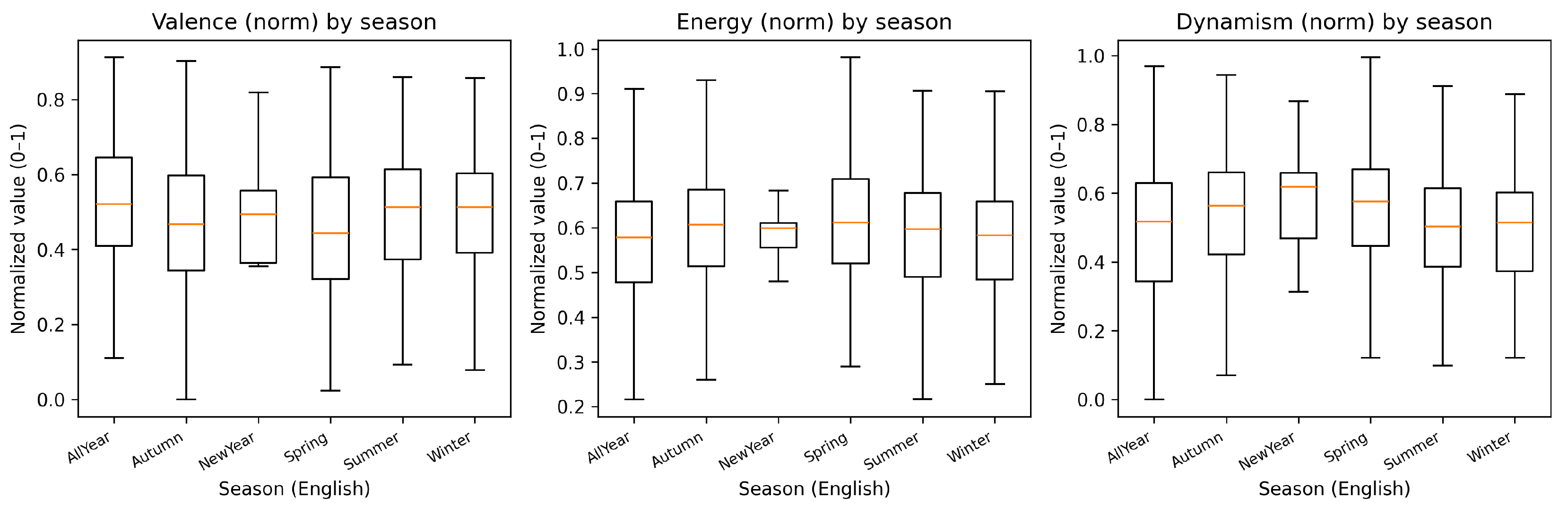 Kruskal–Wallis test results for seasonal differences in normalized Valence, Energy, and Dynamism features. p-values are rounded to two decimals; for Valence and Dynamism, , and for Energy, . Statistical significance is reported qualitatively using the descriptors “significant” () and “highly significant” ().