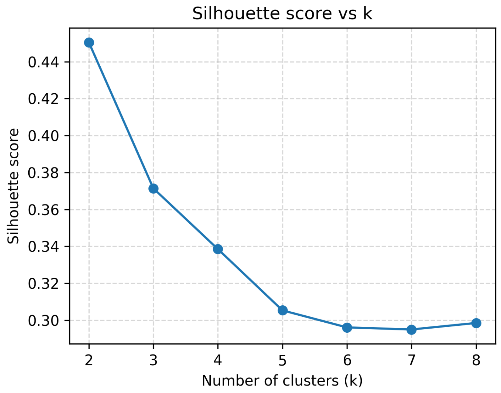 Silhouette scores for different cluster numbers ( to 8) using k-means clustering. The highest silhouette value (0.31) is obtained at , indicating that a three-cluster configuration best represents the underlying emotional structure.