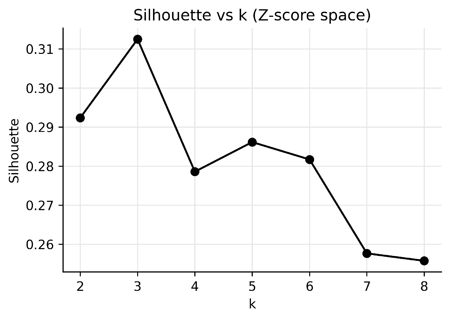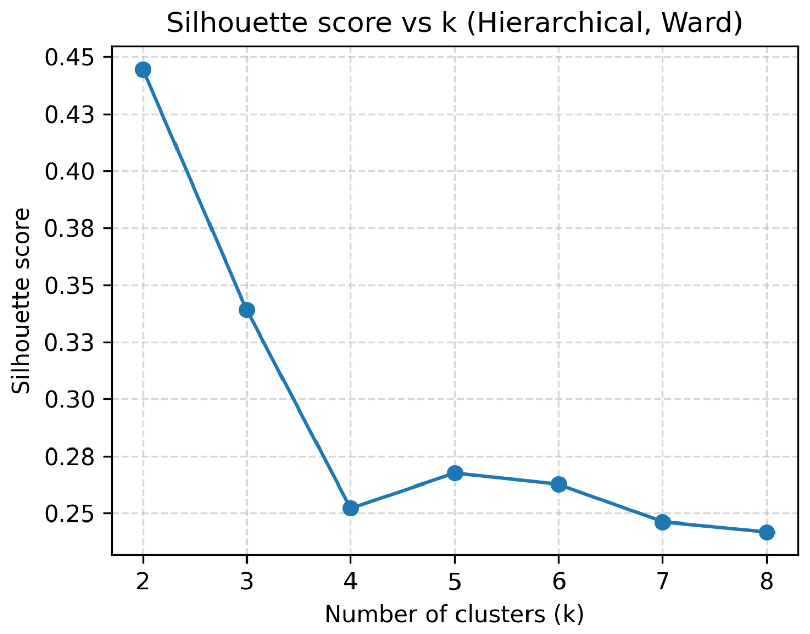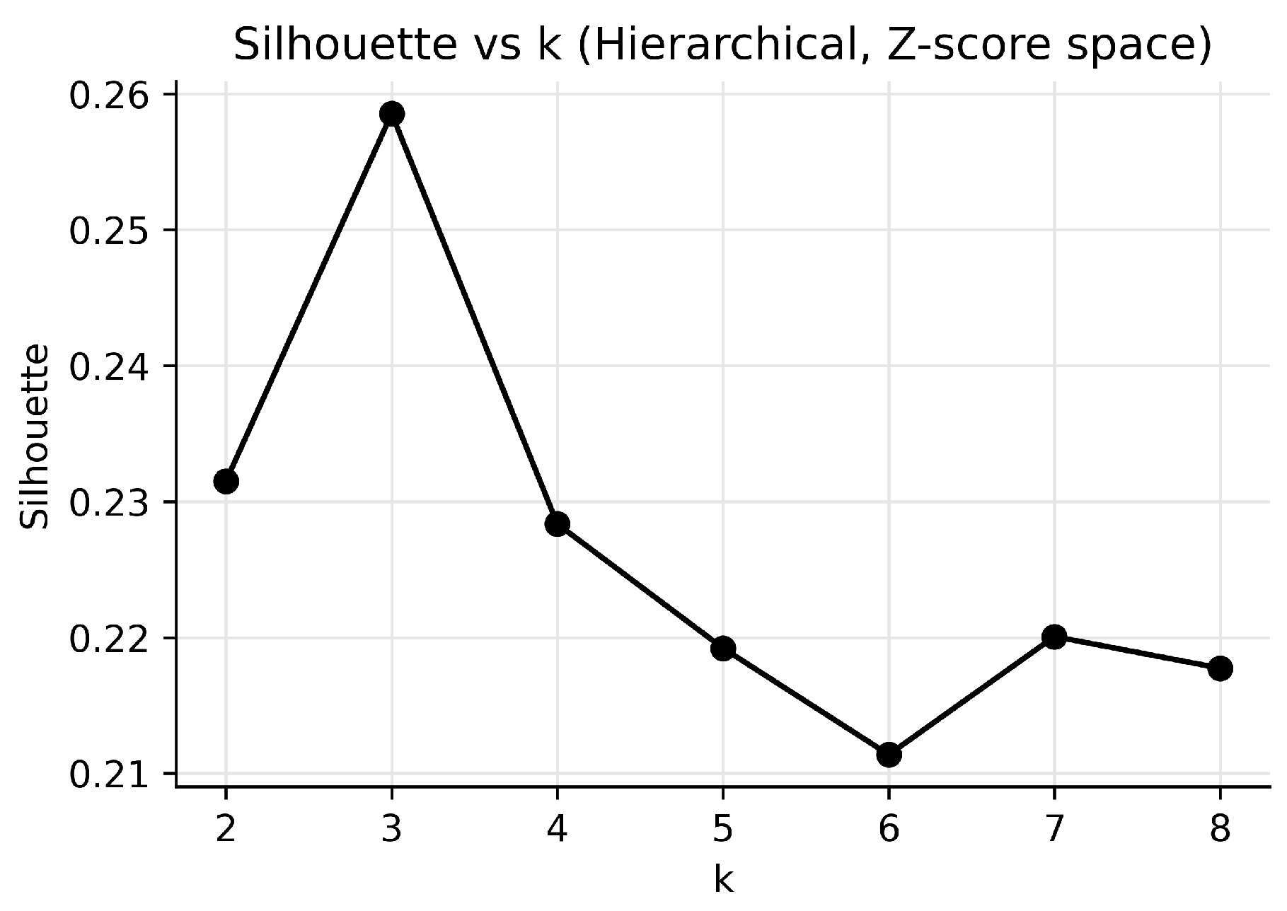 Silhouette scores for different cluster numbers ( to 8) using Ward hierarchical clustering. The highest silhouette value is obtained at , indicating that a three-cluster configuration provides the best structure under this method.