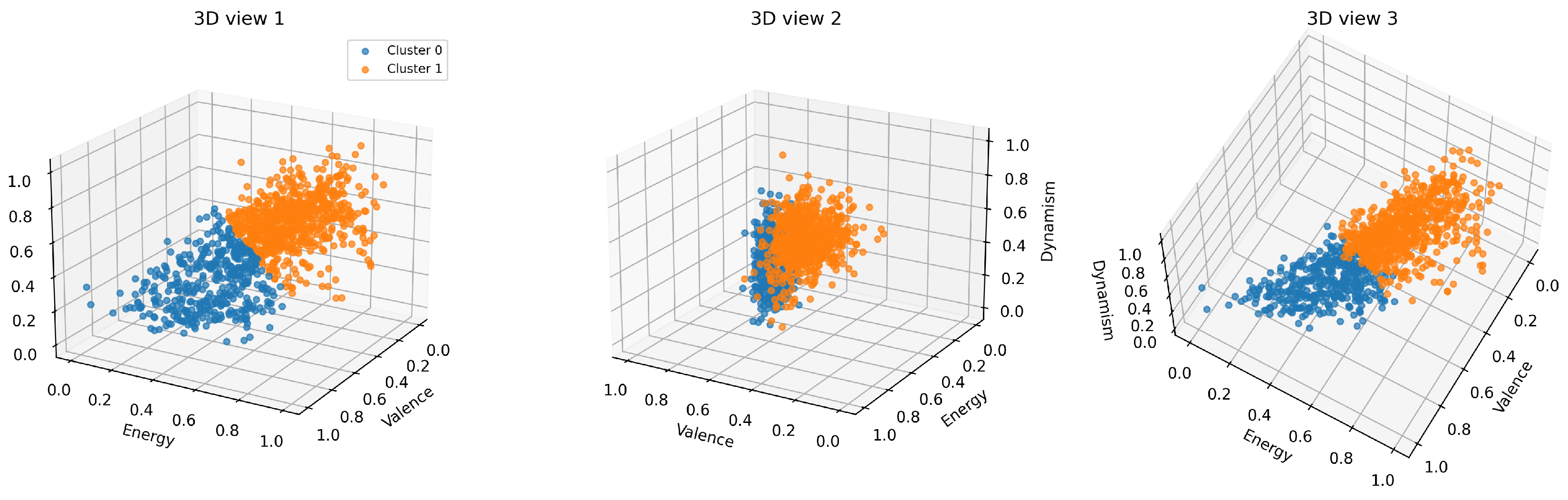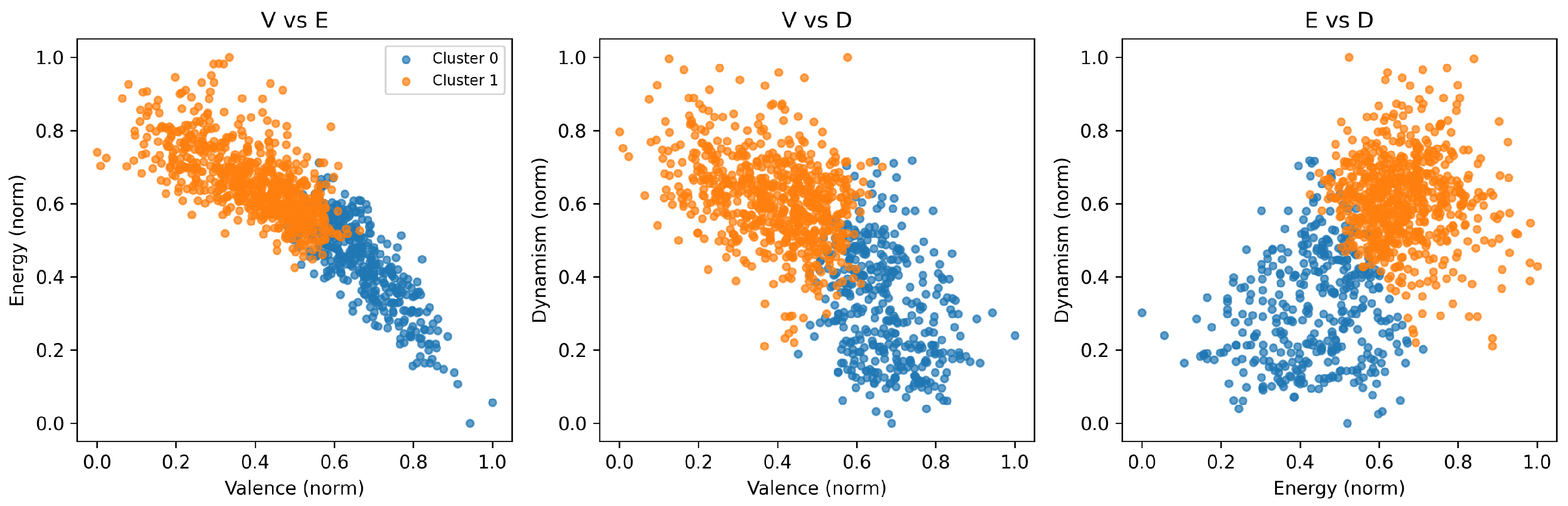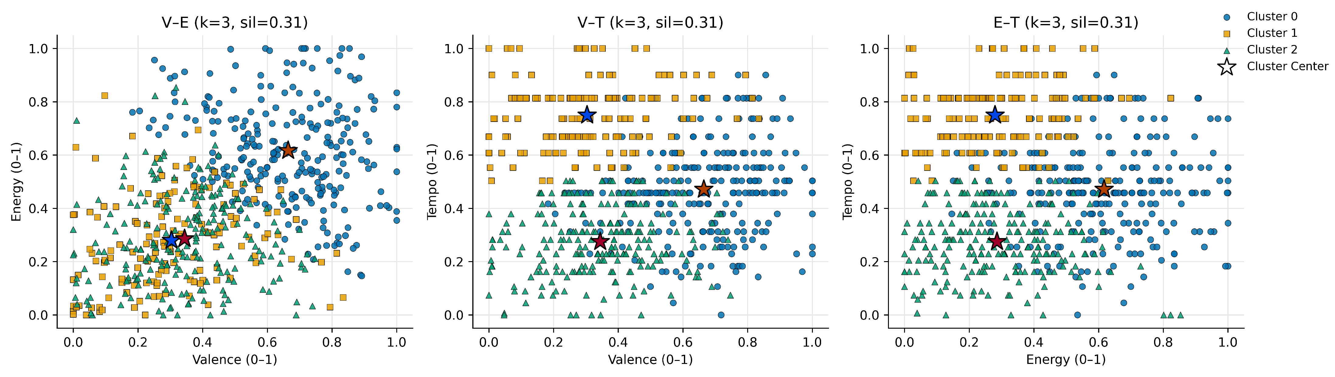 Clustering results projected onto Valence–Energy, Valence–Tempo, and Energy–Tempo planes. Each point represents one music piece; color indicates cluster membership (, silhouette = 0.31).