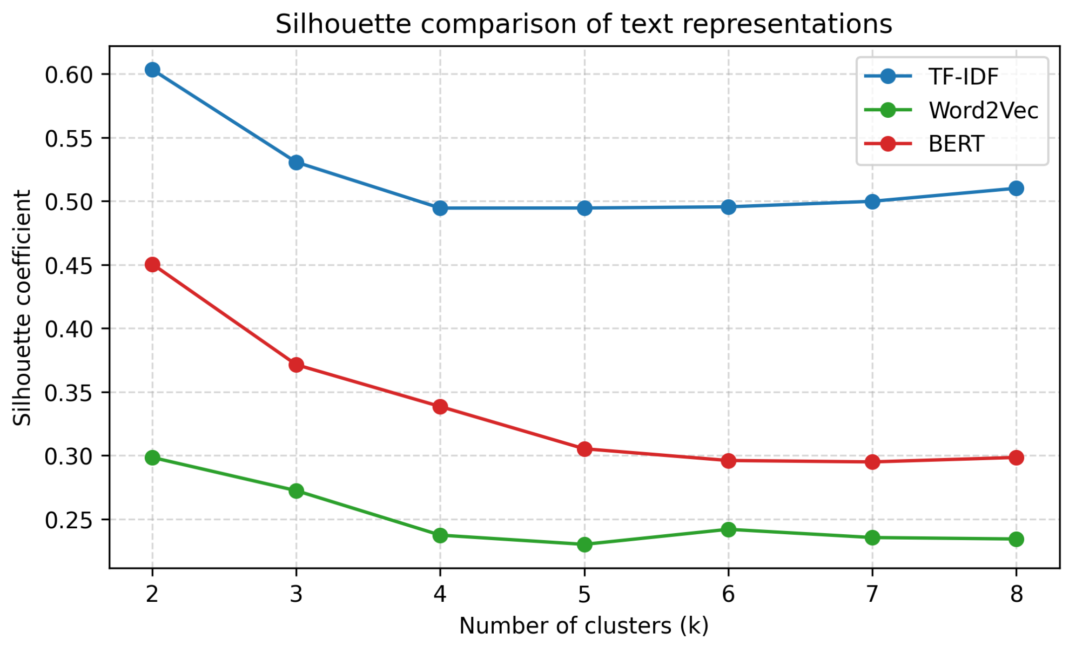 Comparison of silhouette coefficients across TF-IDF, Word2Vec, and BERT embeddings ( to 8).