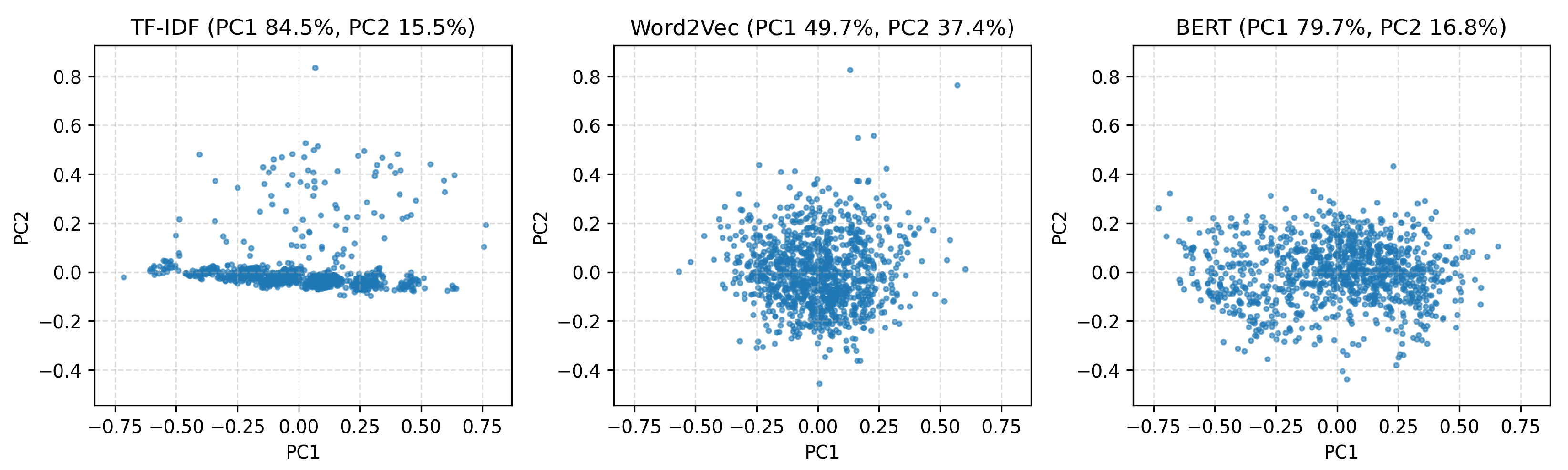 Two-dimensional PCA visualization of haiku embeddings based on TF-IDF (left), Word2Vec (middle), and BERT (right). Each point represents one haiku.