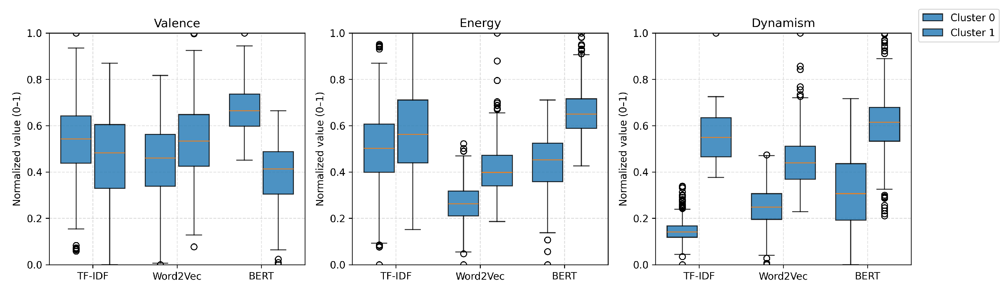Distribution of normalized Valence, Energy, and Dynamism across two clusters () for each model.