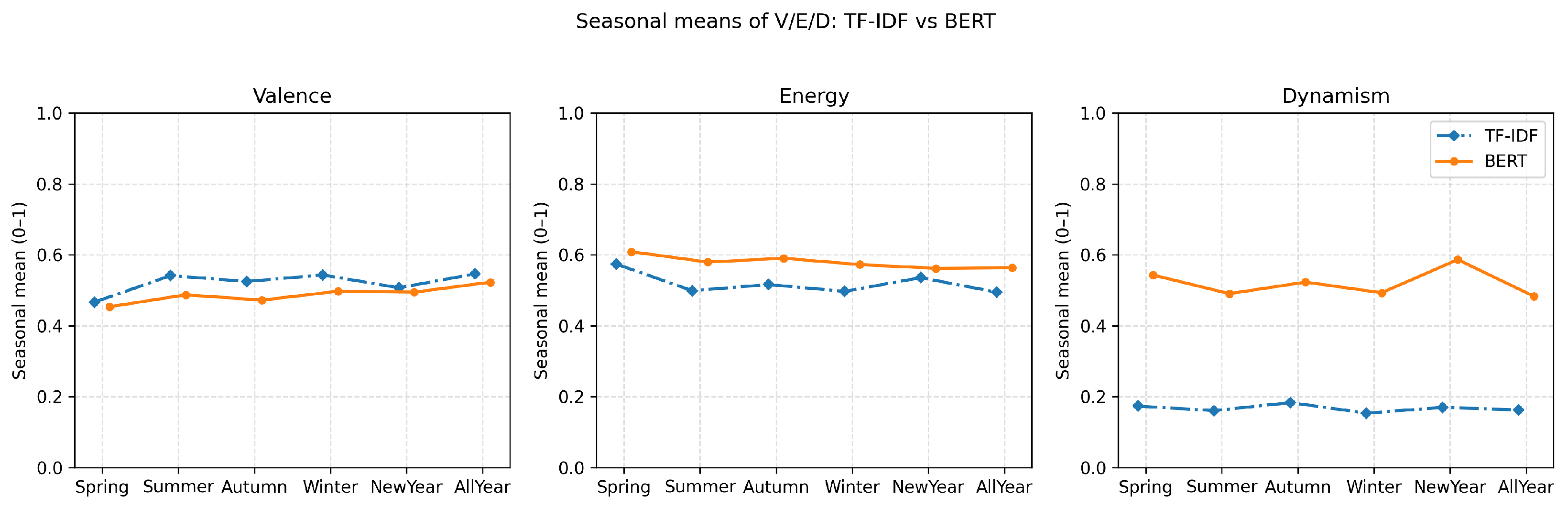 Seasonal means of Valence, Energy, and Dynamism for TF-IDF and BERT encoders.