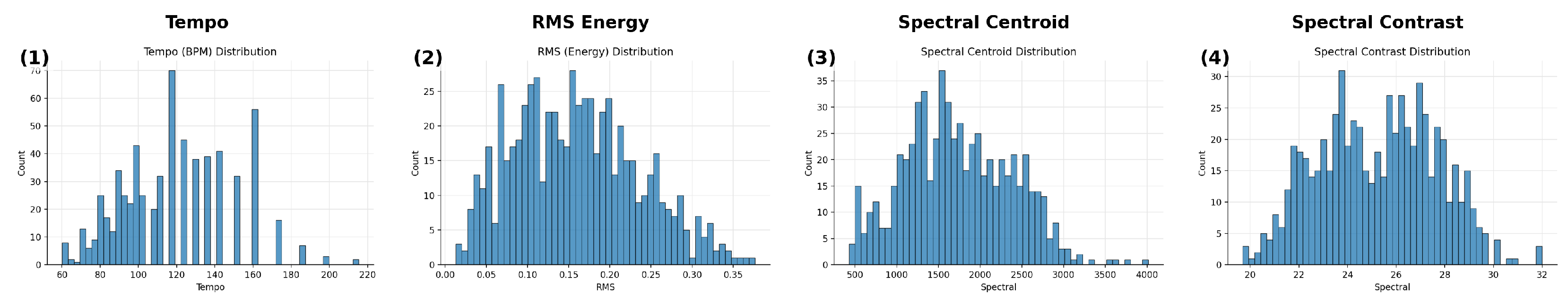 Overall distributions of four representative musical descriptors after robust normalization: (1) Tempo (BPM), (2) RMS Energy, (3) Spectral Centroid (Hz), and (4) Spectral Contrast (dB). Each feature was clipped to the 1st–99th percentile and rescaled to the range. The distributions are smooth and balanced, indicating numerically stable feature extraction.