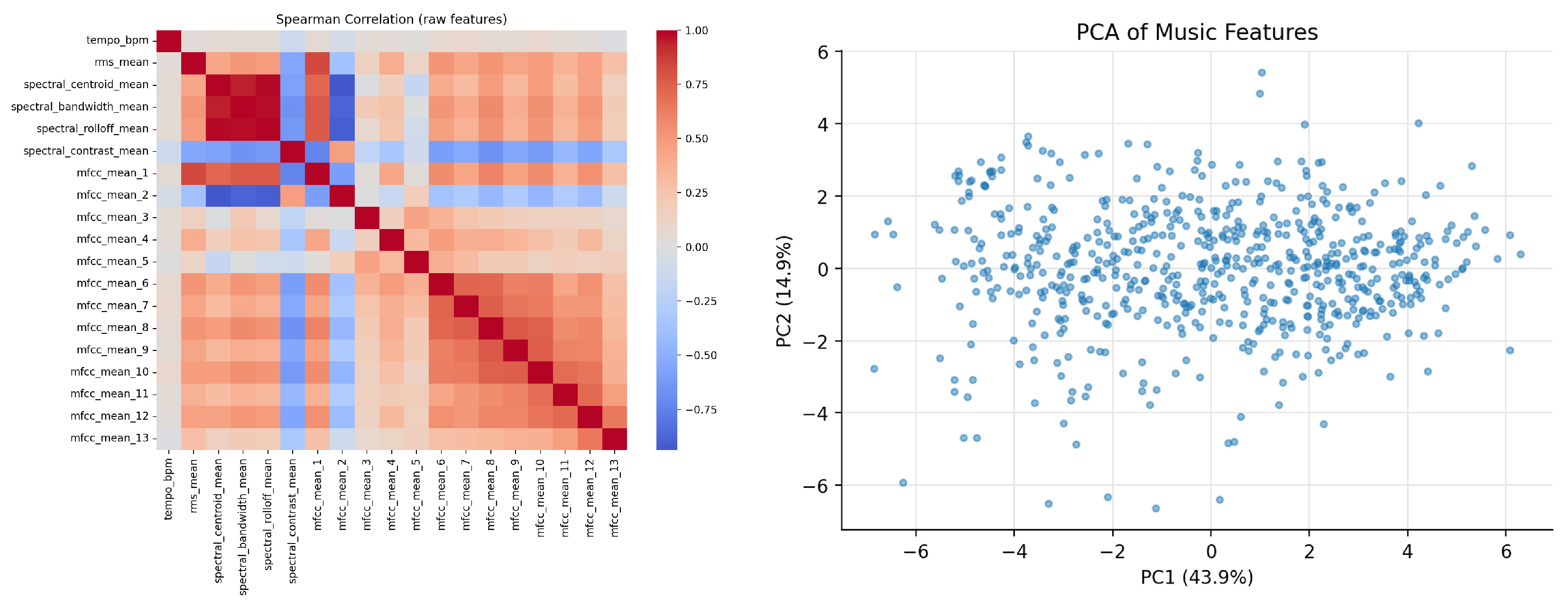 (Left) Spearman correlation heatmap among acoustic features, showing high internal consistency. (Right) PCA scatter plot, where PC1 corresponds to the Energy–Brightness axis and PC2 to the Tempo–Contrast axis, explaining about 67% of total variance.