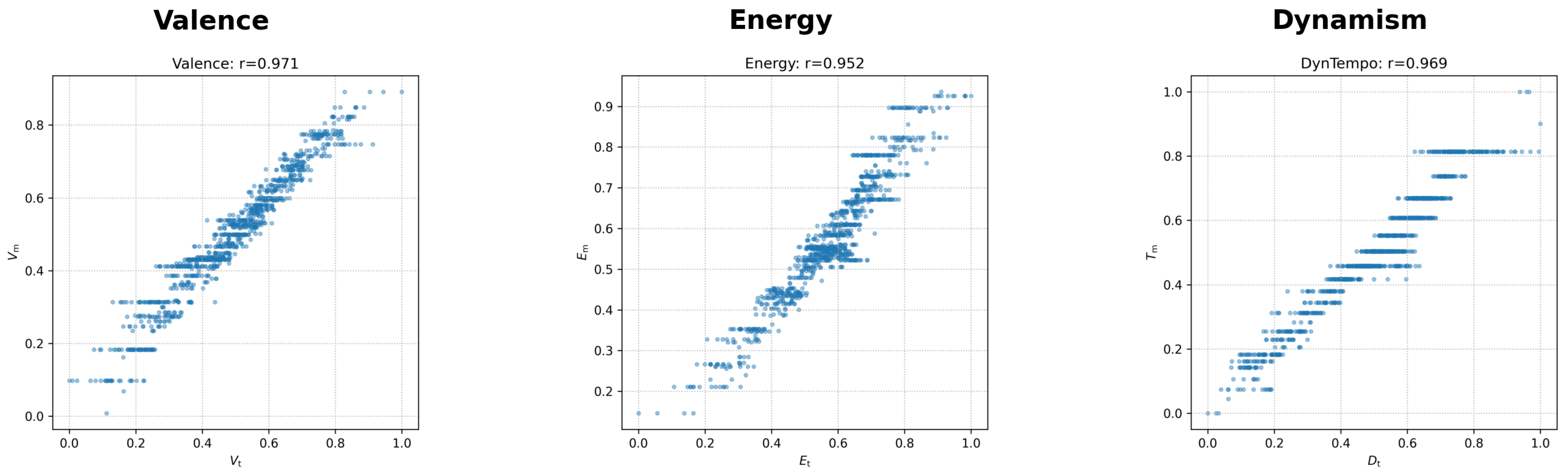 Axis-wise haiku–music alignment (Experiment D-1). Scatter plots for Valence, Energy, and Dynamism/Tempo show diagonal tendencies, indicating high cross-modal consistency. The displayed r values correspond to the empirical correlations of the matched pairs.