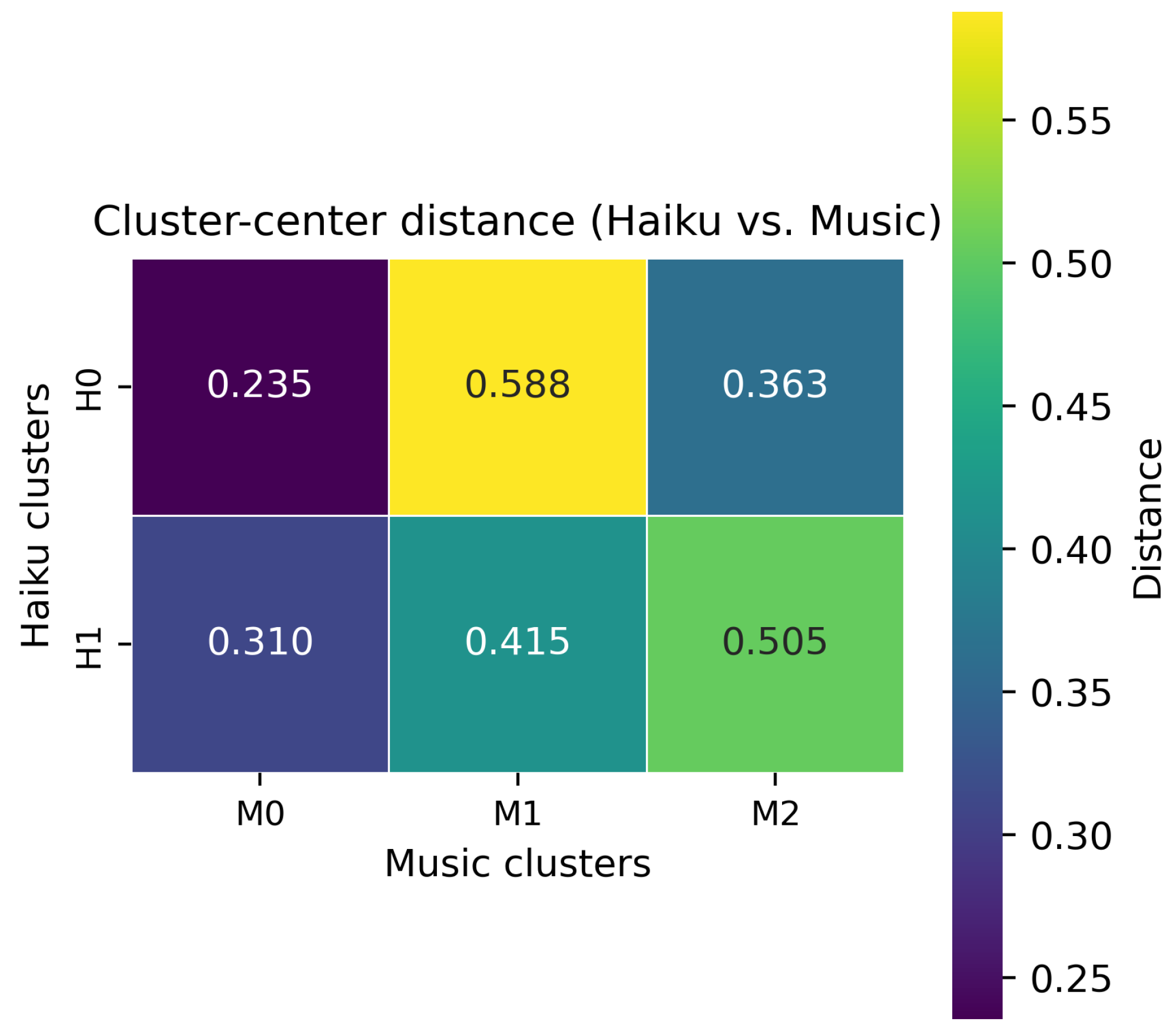 Cluster-center distances between haiku and music clusters (Experiment D-2). Each cell shows the Euclidean distance between a haiku cluster centroid and a music cluster centroid in the normalized affective space . Lower values indicate closer affective positions.