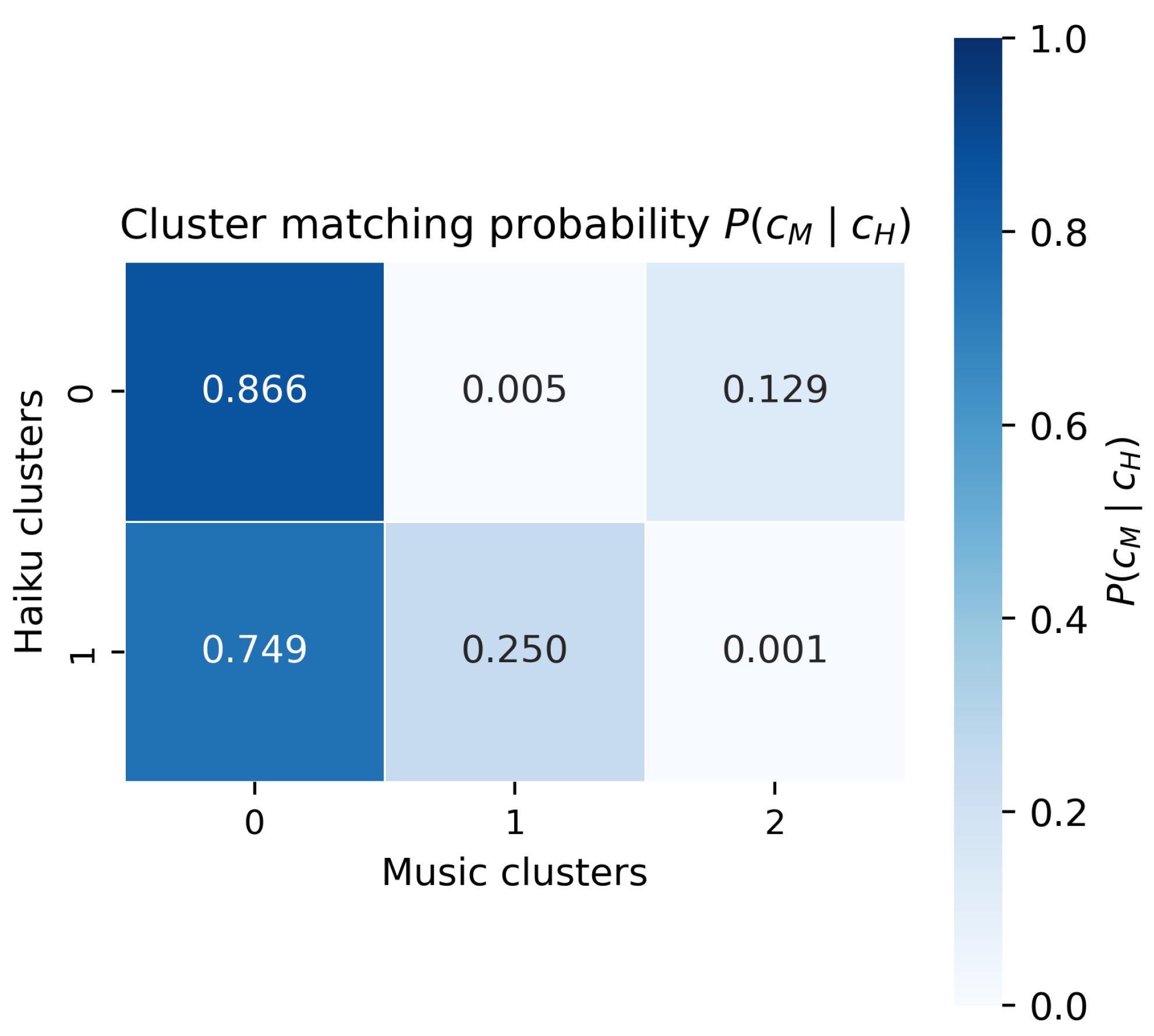Cluster matching probabilities (Experiment D-2). Each cell shows the conditional probability that a haiku from cluster is matched to music from cluster , based on the 1067 haiku–music pairs. Darker cells indicate higher matching probability.