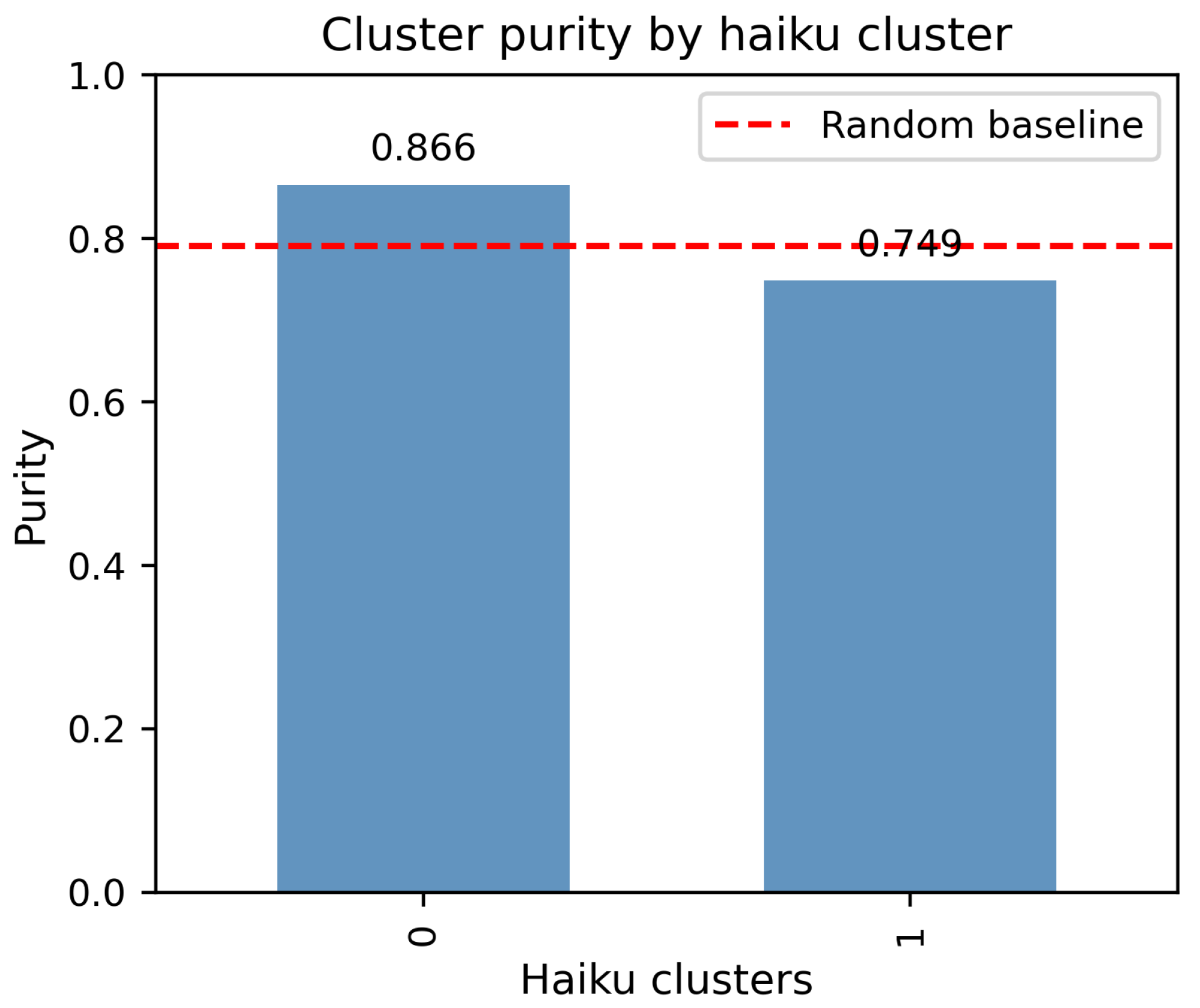 Cluster purity of haiku–music matches (Experiment D-2). Bars indicate the purity of each haiku cluster, defined as , and the dashed horizontal line shows the average purity under random shuffling of music-cluster labels. The observed average purity () is higher than the random baseline ().