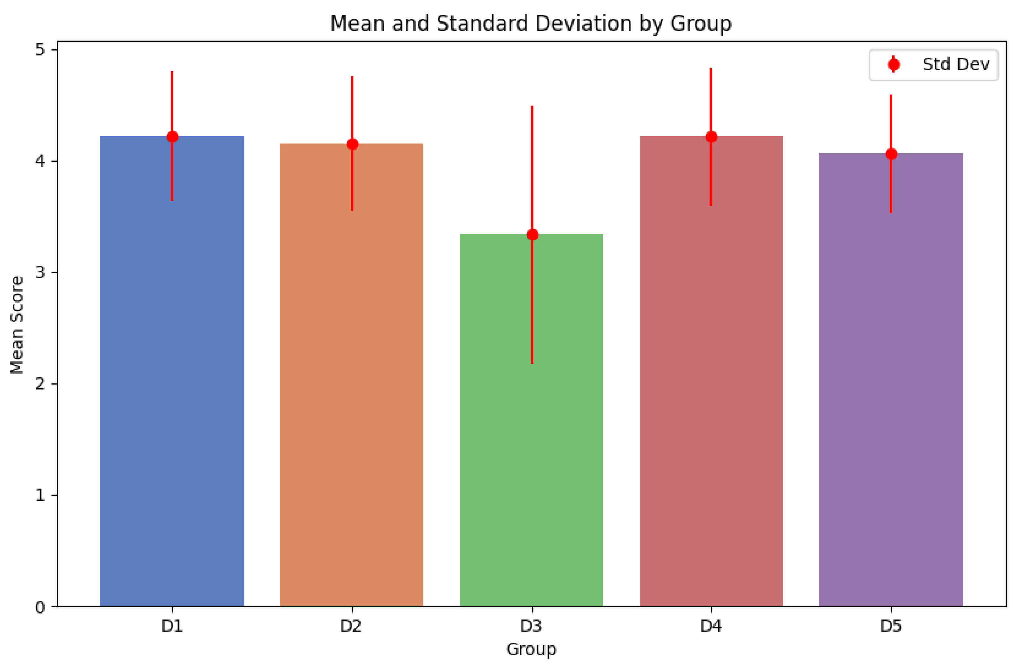 Score distribution for demonstrations (D1 to D5) is shown in the histograms and kernel density estimates. These show the distribution of participant ratings for each demonstration. Scores range from 1 (strongly disagree) to 5 (strongly agree).