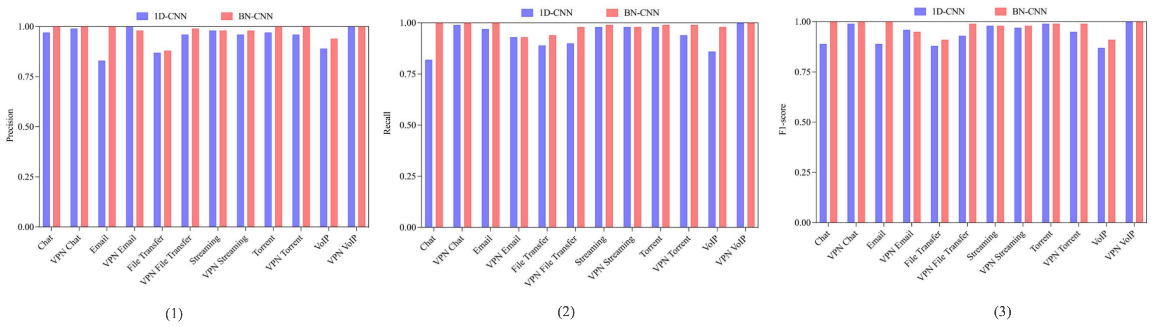 - A Lightweight Local Model: We design a lightweight local model architecture that integrates a 1D-CNN with Batch Normalization (BN), termed BN-CNN. This design is tailored for efficient feature extraction from preprocessed traffic sequences. Experiments on the ISCX VPN-NonVPN 2016 dataset confirm that BN-CNN achieves superior accuracy and F1-score over traditional baselines.