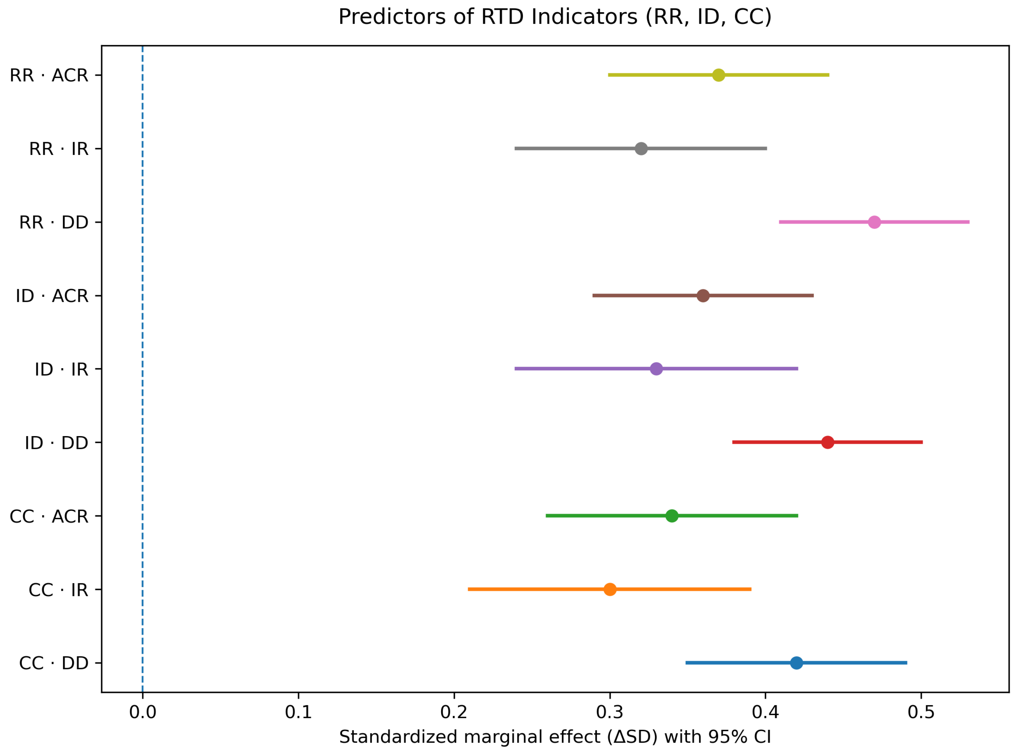 The effect sizes also give a sense of their practical meaning. For example, higher DD values often corresponded to noticeably more rework. The effects for ACR and IR are smaller but still meaningful: a single change event or invalidation corresponds to a modest increase in the RTD indicators, consistent with the idea that even isolated revisions can trigger downstream adjustments. In other words, the magnitude of these effects suggests that structural interconnectedness (DD) plays a more prominent role than the occurrence of change alone, though both dimensions contribute to the accumulation of technical debt during modeling.