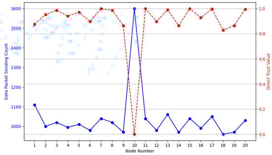 Third, in our trust model, the weights of various trust metrics are dynamically and automatically assigned based on their values through an algorithm when calculating the combined trust value. This prevents a malicious node’s good performance in one aspect from masking its malicious behaviour in another aspect. In previous trust models [12,33], researchers left the task of assigning weights to users, which raised a significant obstacle standing in the way of the widespread application of trust models. In [10], fixed weights were used for the metrics of the data packet forwarding rate and control packet forwarding rate, resulting in poor flexibility and accuracy. The model proposed in [13] did not involve this weight assignment issue but considered using a complex IDS module.