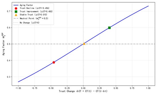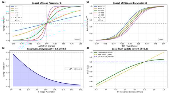 Sensitivity analysis of the logistic aging function under different slope parameters , midpoints , and trust update behaviours. (a) Impact of slope parameter : Larger makes the aging factor curve steeper and increases the sensitivity of the system to trust changes, while smaller produces smoother transitions. (b) Impact of midpoint parameter : Shifting moves the logistic curve horizontally, adjusting the tolerance range so that small fluctuations near can be either emphasized or suppressed. (c) Sensitivity analysis: When ΔCT is fixed (e.g., ), increasing leads to a monotonic decrease in the aging factor, revealing how controls the reaction strength to a given trust change. (d) Local trust update: The updated local trust reflects the weighted combination of historical trust and new trust.