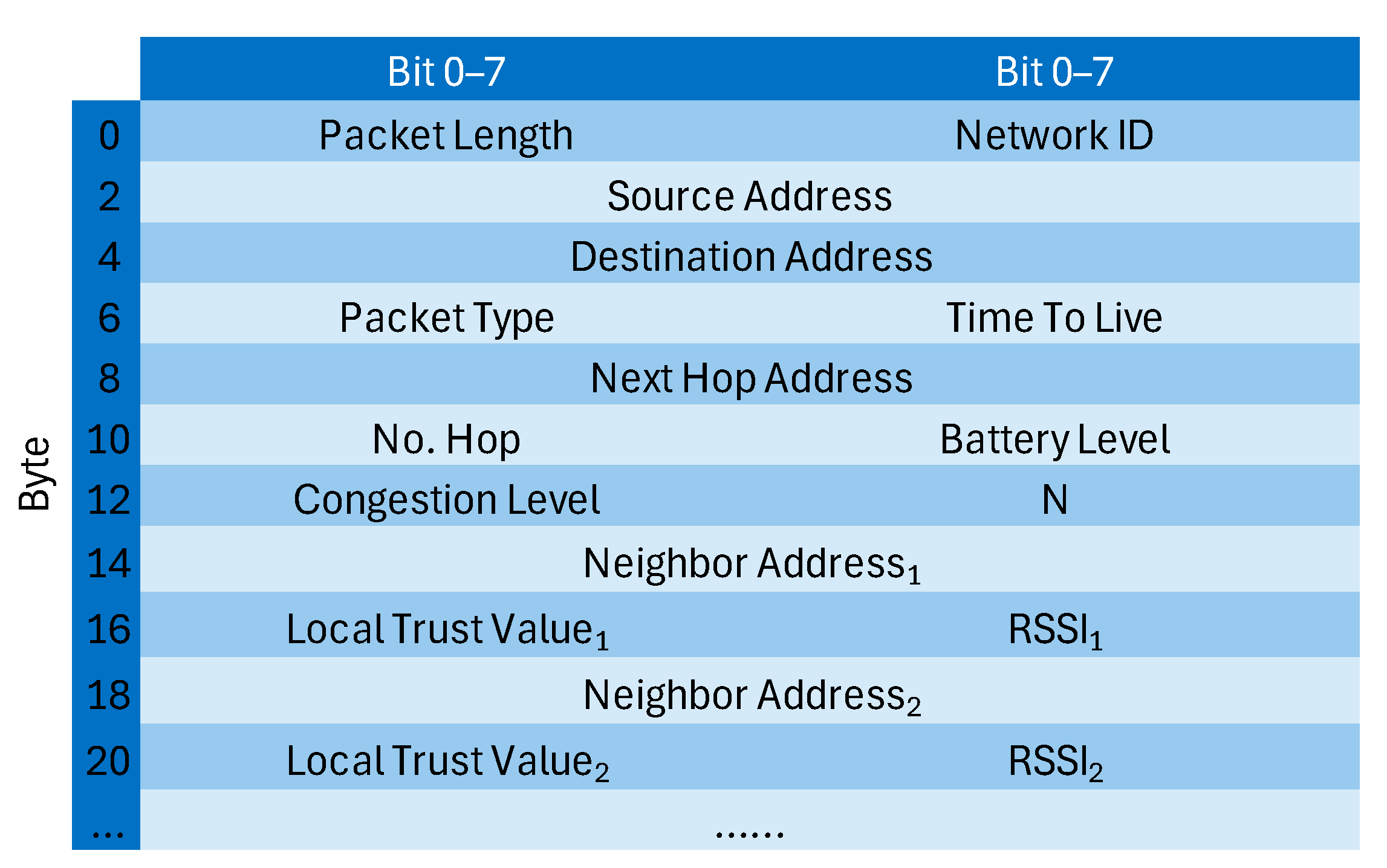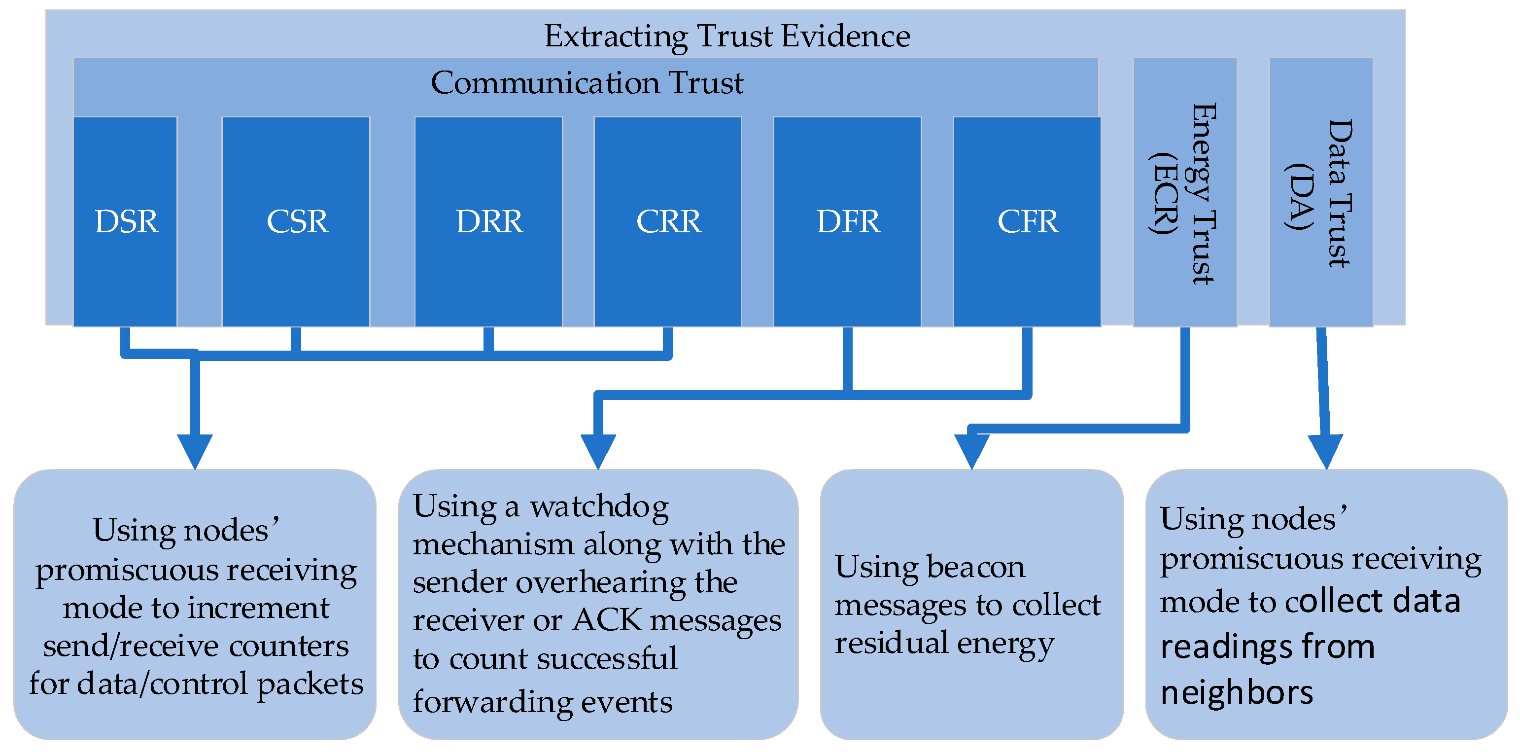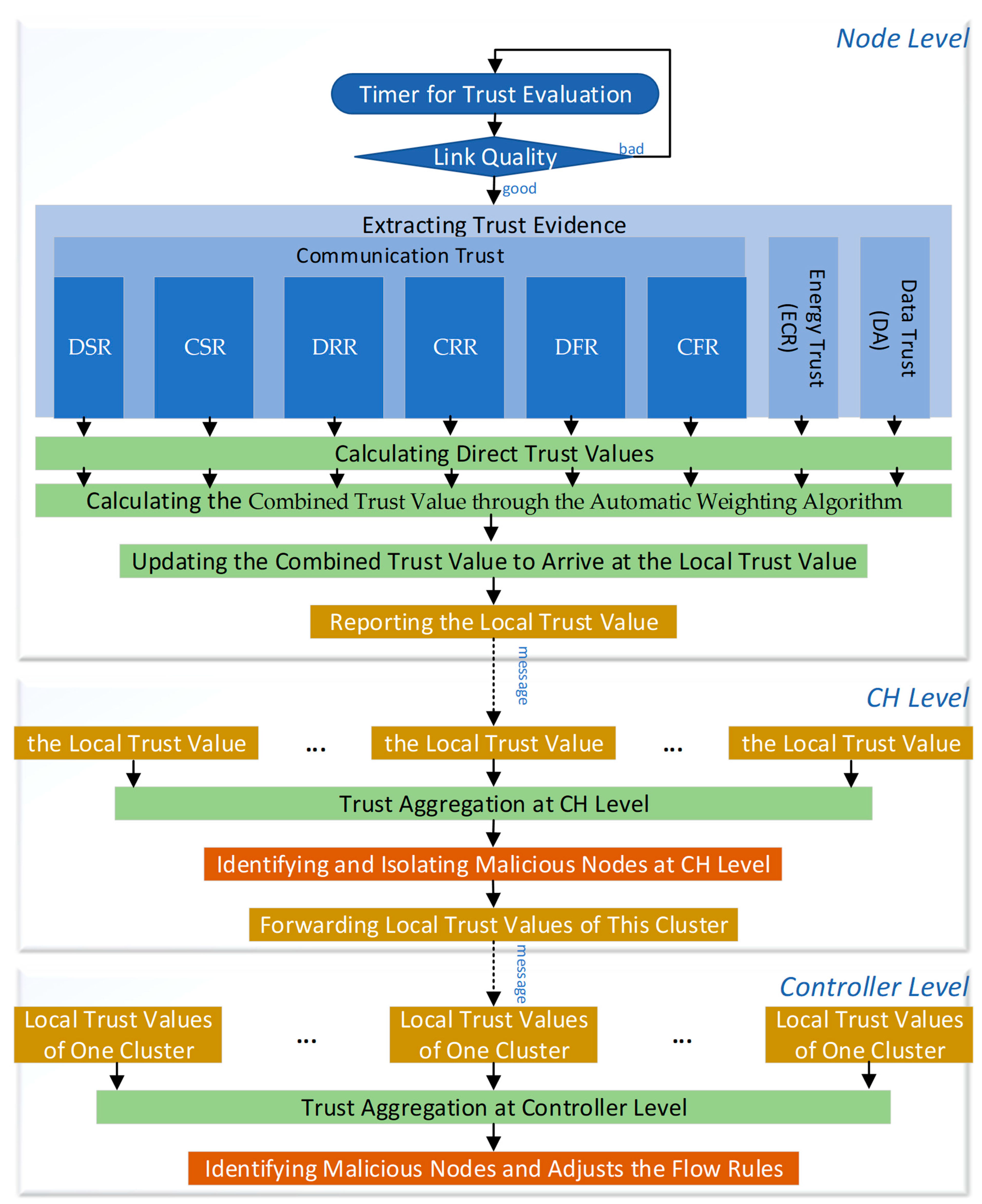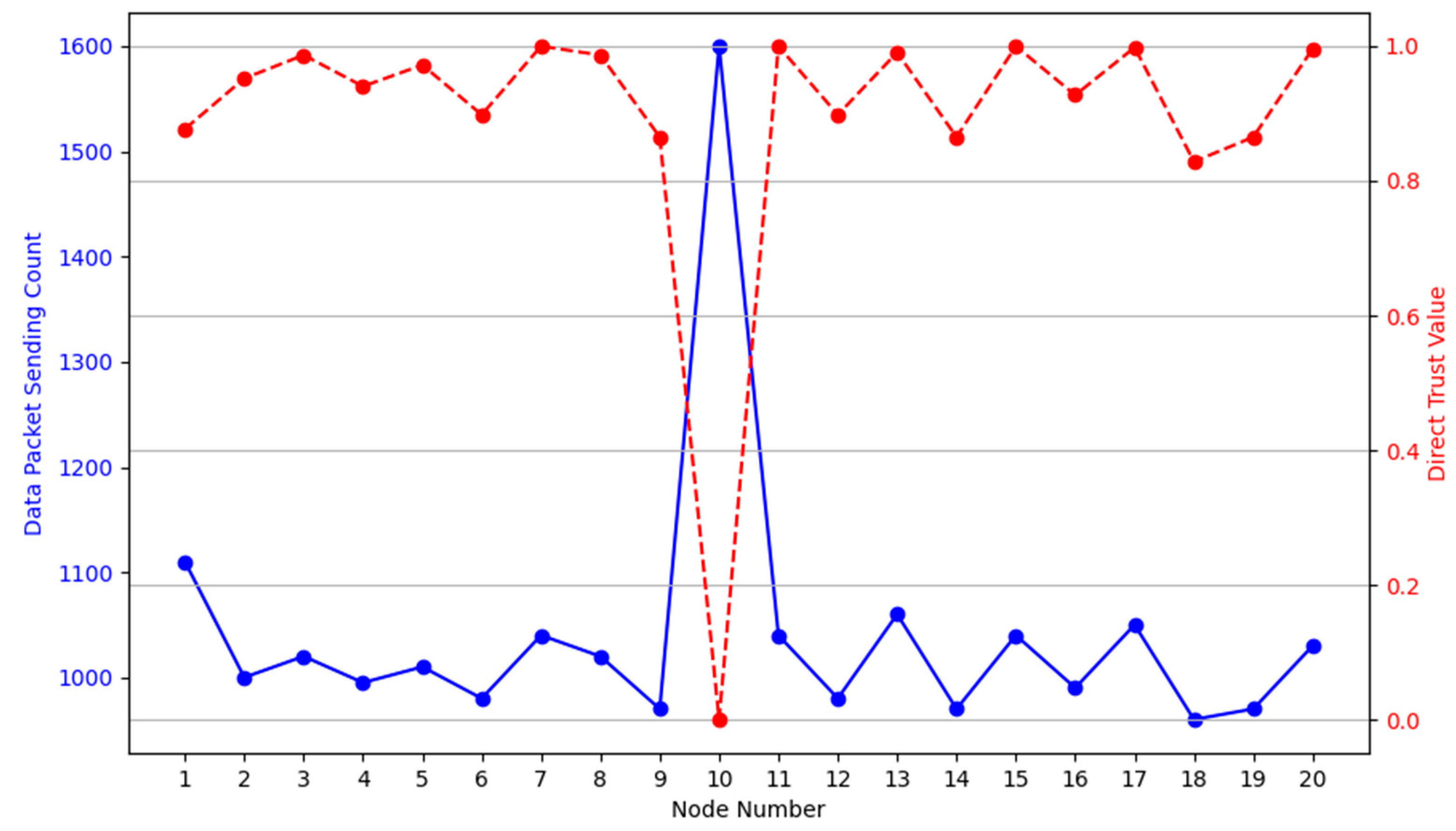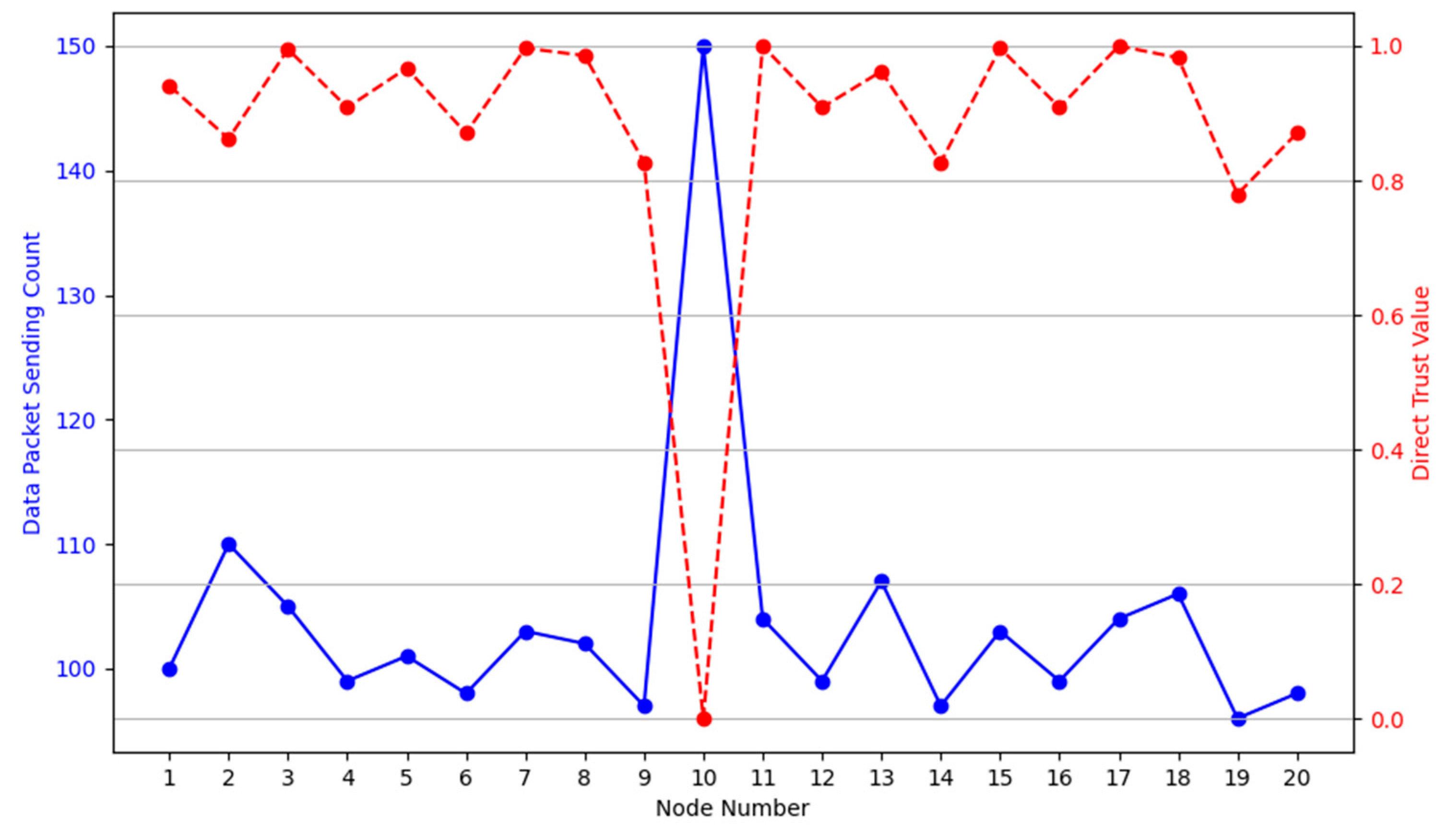 40]. However, it is not included in the proposed trust model because DoS attacks typically manifest through abnormal transmission rates and forwarding behaviours rather than size anomalies [