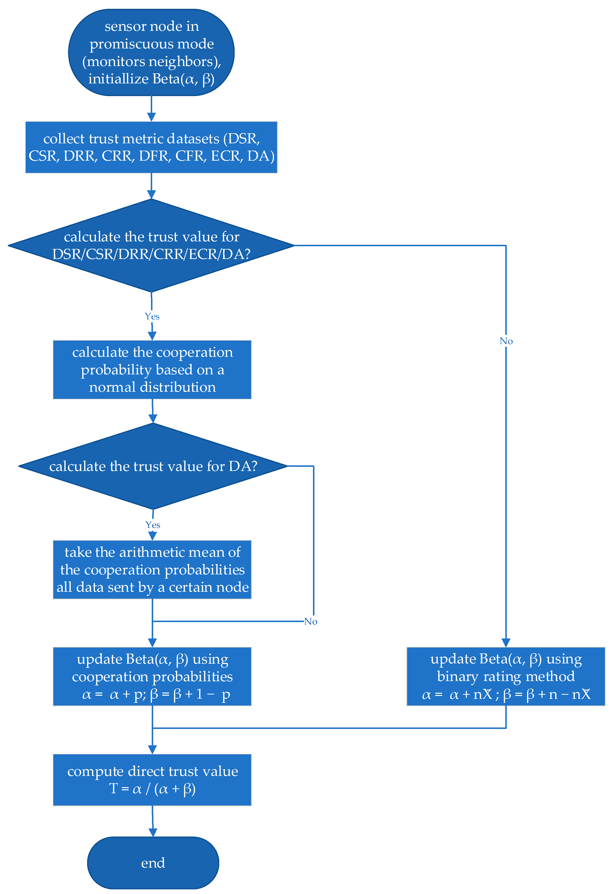 In contrast, the forwarding-related metrics, DFR and CFR, represent fundamentally different types of evidence. Forwarding is not a continuous measure but a discrete binary event: a packet is either forwarded successfully or it is not. Consequently, it is neither meaningful nor necessary to compute a probabilistic cooperation value based on distributional assumptions. Instead, forwarding trust is modelled using a binary assignment, where successful forwarding (observed through listening or ACK mechanisms) is assigned a cooperation value of 1 and unsuccessful forwarding is assigned a value of 0. These binary outcomes are then directly incorporated into the Bayesian Beta method. The processes of direct trust value calculation are shown in