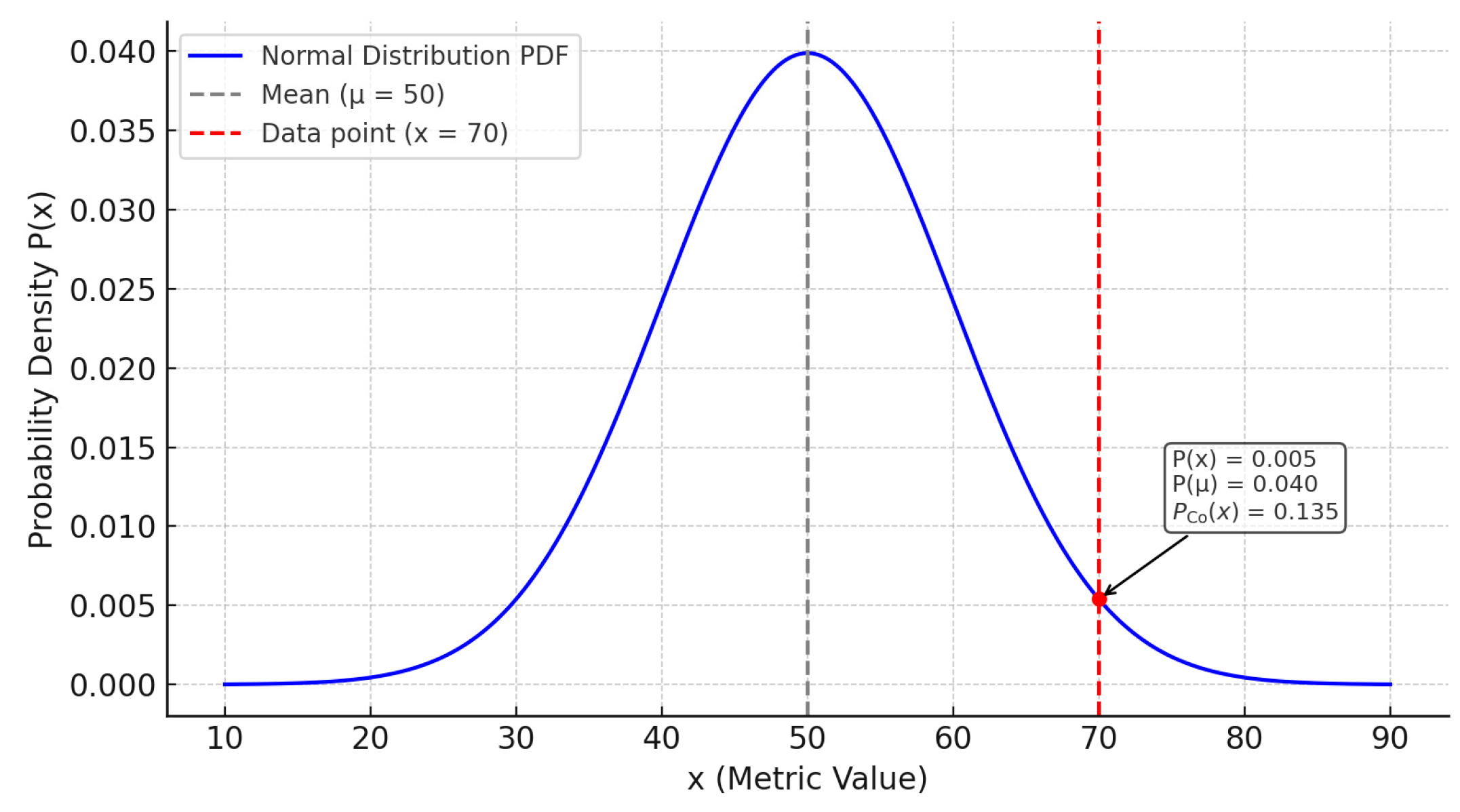 is not the actual probability but the probability density value, indicating the relative frequency of occurrence near that point. The higher the density, the closer the data point is to the center (mean), and the higher the probability of occurrence; the lower the density, the further it is from the mean, possibly indicating an outlier. The curve of a Gaussian distribution probability density function is shown in
