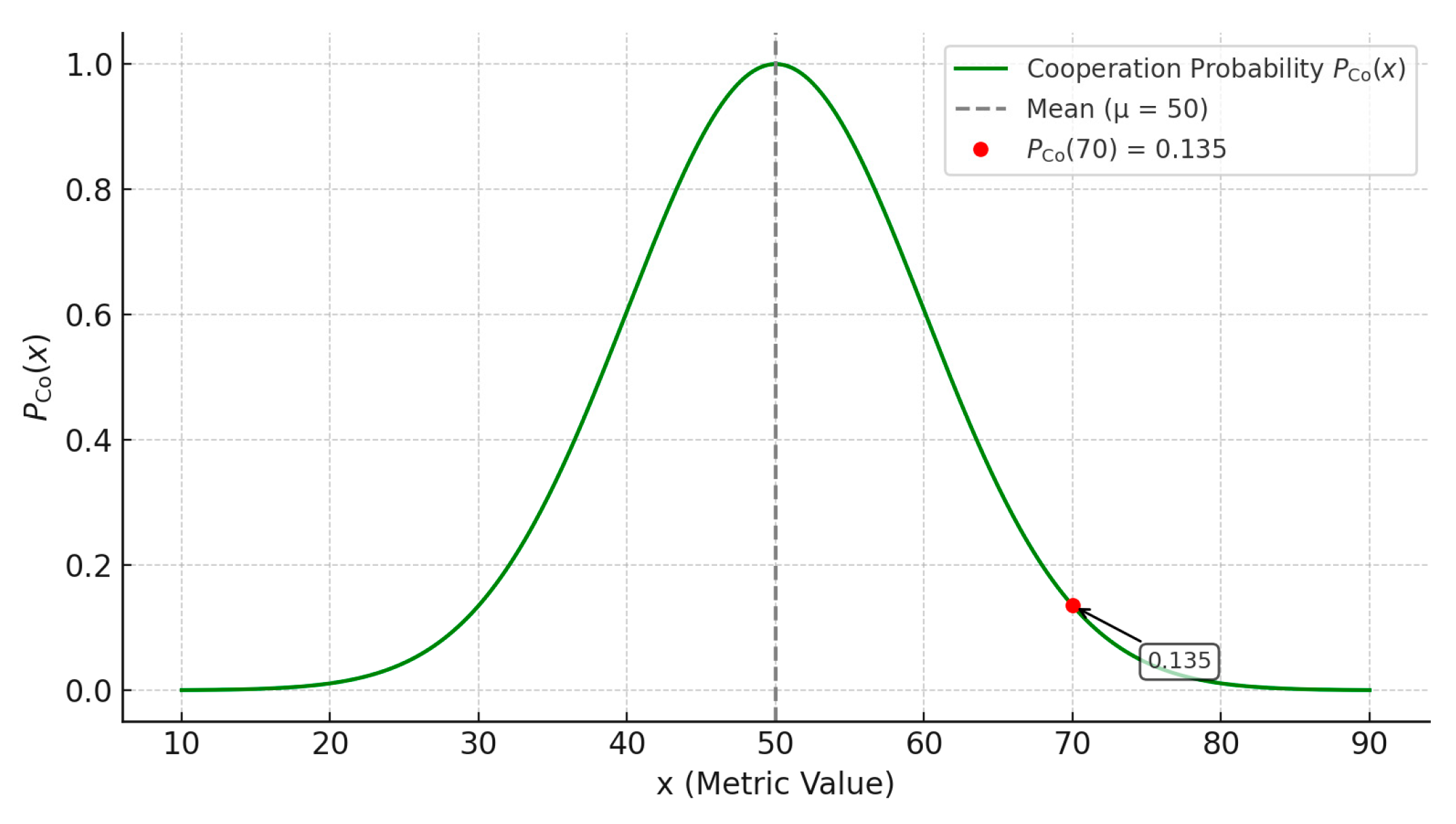 From this figure, we can see the range of the cooperation probability is from 0 to 1. The closer the value is to the mean, the closer its cooperation probability is to 1; the further away from the mean, the closer its cooperation probability is to 0.