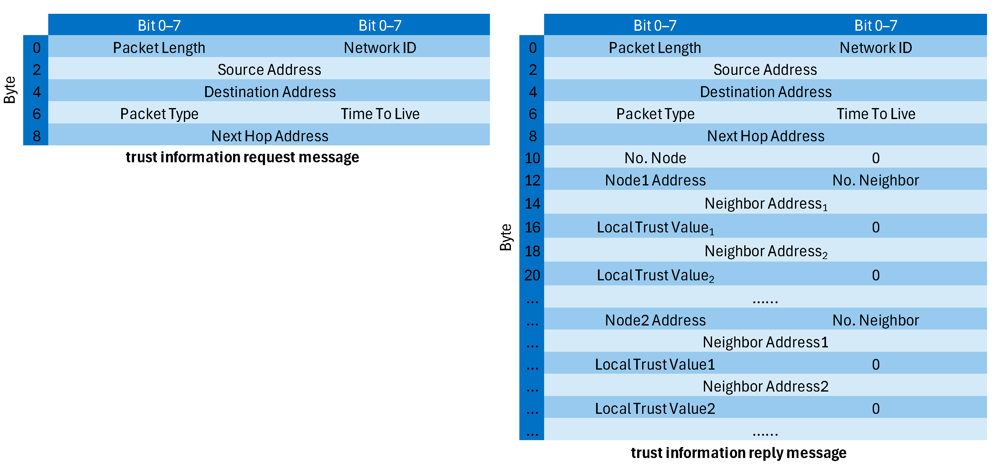 To ensure that trust dissemination remains lightweight, the real-valued trust scores computed in the previous section (ranging from 0 to 1 and represented as 4-byte floating-point numbers) are converted into 1-byte unsigned integers in the range of [0, 100], following the approach in ETMRM [
