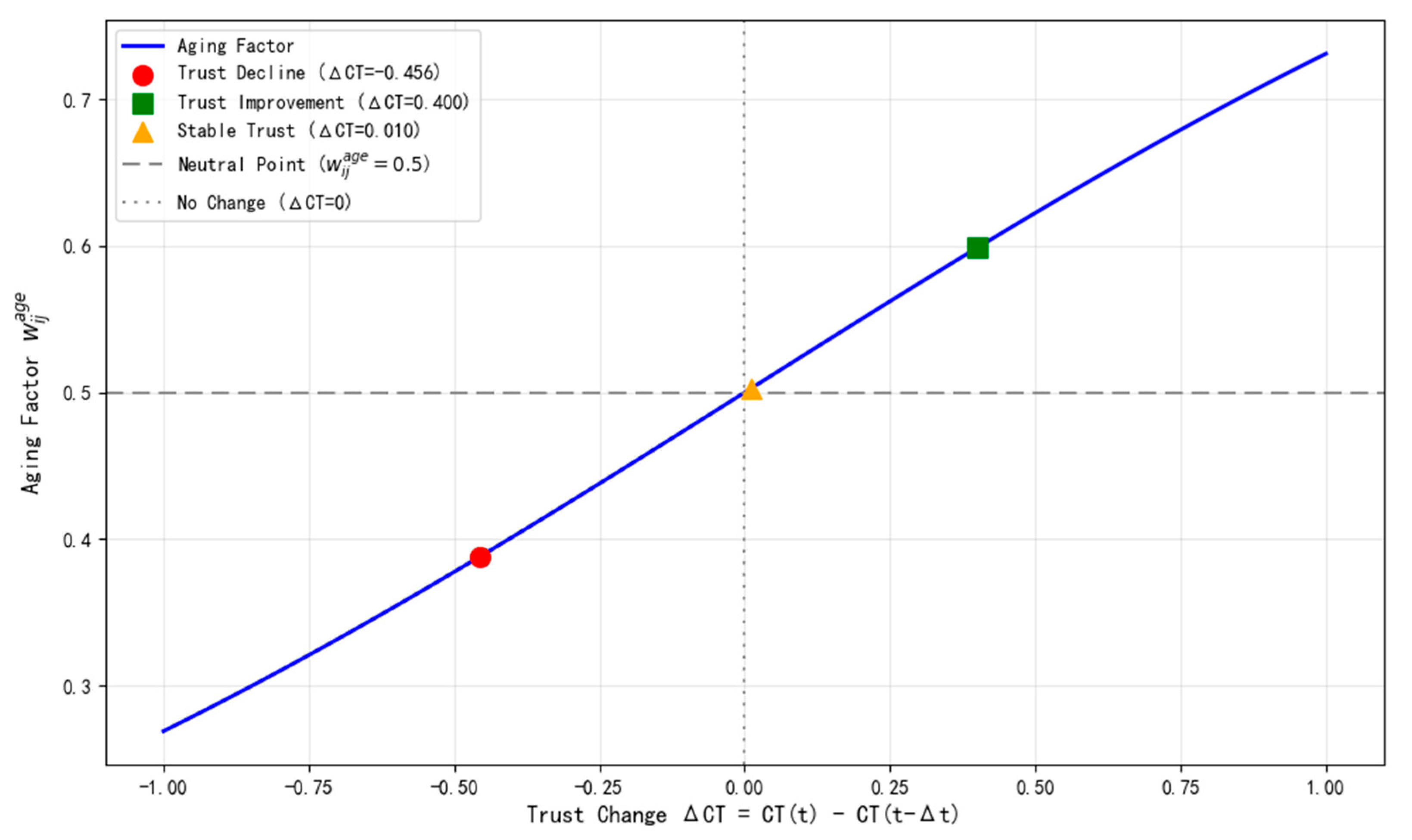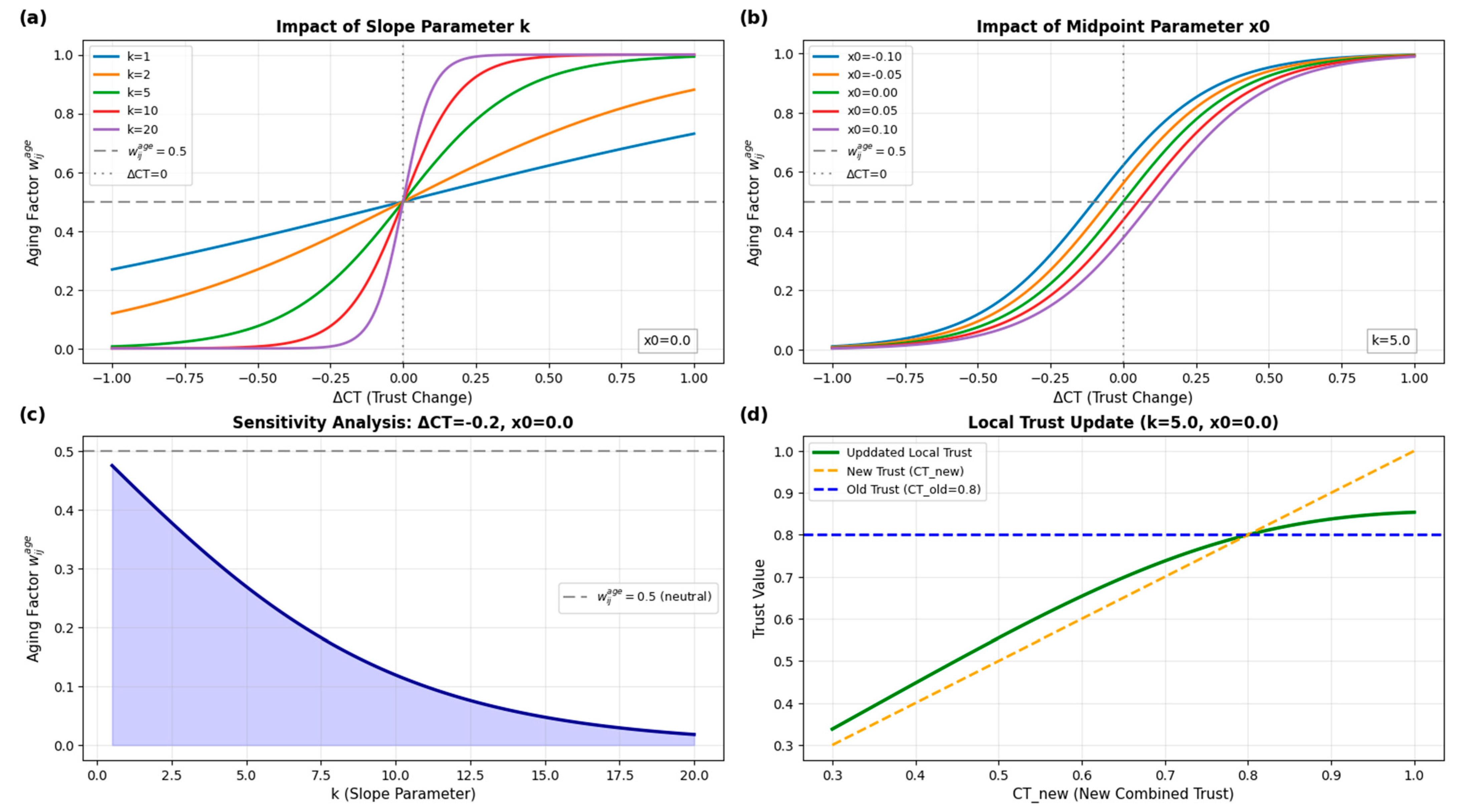 44] we perform a nonlinear transformation to convert the change from the historical to the current combined trust value into an aging factor. We introduce explicit parameters for the slope (