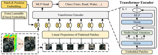 Transformers, a pivotal innovation in sequence modeling, have revolutionized multifarious research domains encompassing natural language processing (NLP) and computer vision (CV) [36]. By introducing the self-attention mechanism, they overcome the sequential constraints of recurrent neural networks (RNNs), allowing the acquisition of long-range dependencies and comprehensive contextual information within sequences [45,46,47]. The Vision Transformer (ViT), which adapts Transformer frameworks for vision tasks, represents a significant advancement in computer vision. Unlike RNNs that process images sequentially or through specialized convolutional operations, ViT treats images as sequences of patches. This allows for the direct application of the self-attention mechanism within the Transformer architecture to capture global dependencies among image patches. The schematic diagram of ViT is shown in Figure 1.