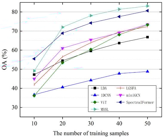 Figure 9 reveals that MSSL achieves progressive improvement in OA with increasing . This occurs because a large-scale labeled training set provides richer discriminative knowledge for learning underlying feature representations. However, labeled data for HSI are often insufficient, making it necessary to classify image pixels with a limited number of labeled pixels. MSSL efficiently learns the intrinsic features of hyperspectral data by constructing self-supervised learning signals and designing a manifold geometry-guided contrastive loss function, which holds high application value.