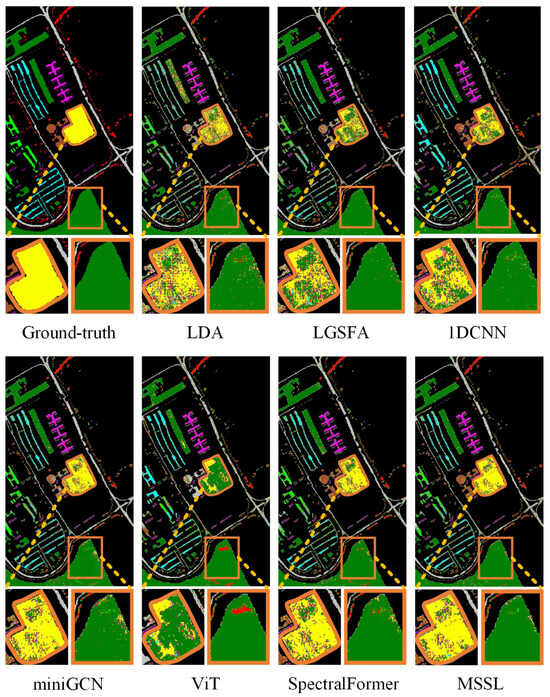 To further validate the efficacy of MSSL, the PaviaU dataset was introduced for quantitative experimental analysis, and classification maps were generated for visual assessments. A randomly chosen 2% of labeled data constituted the training set, with the complement allocated to testing. The corresponding experimental results are presented in Table 3 and Figure 11.
