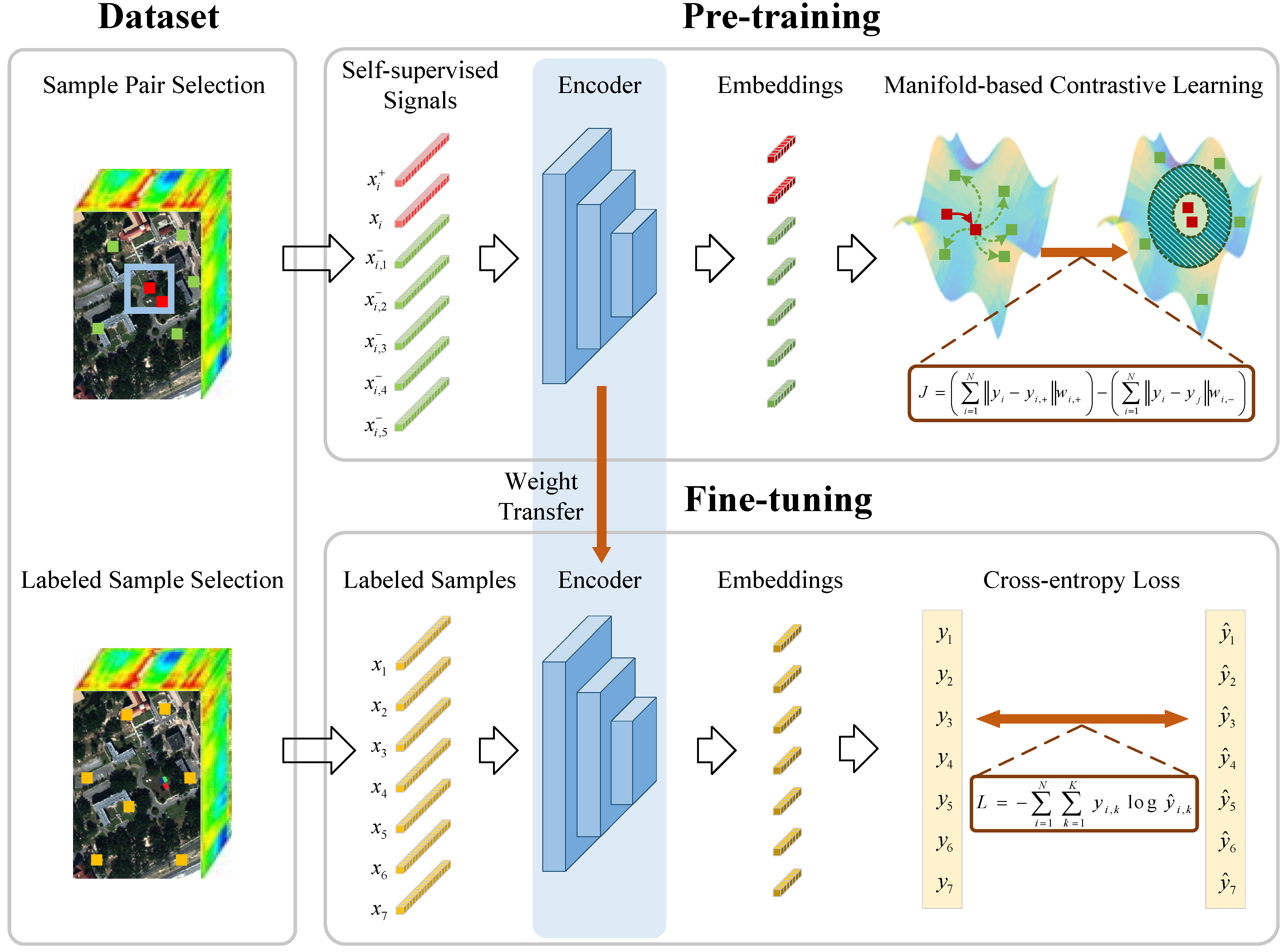 - By combining manifold learning with self-supervised learning, MSSL formulates a manifold geometry-guided contrastive loss function. This function investigates the inherent manifold geometric structure of HSI. It decreases the proximity among positive sample pairs and simultaneously increases the separation among negative sample pairs. Consequently, the model enhances its ability to discriminate between sample categories and to learn the corresponding mapping function.