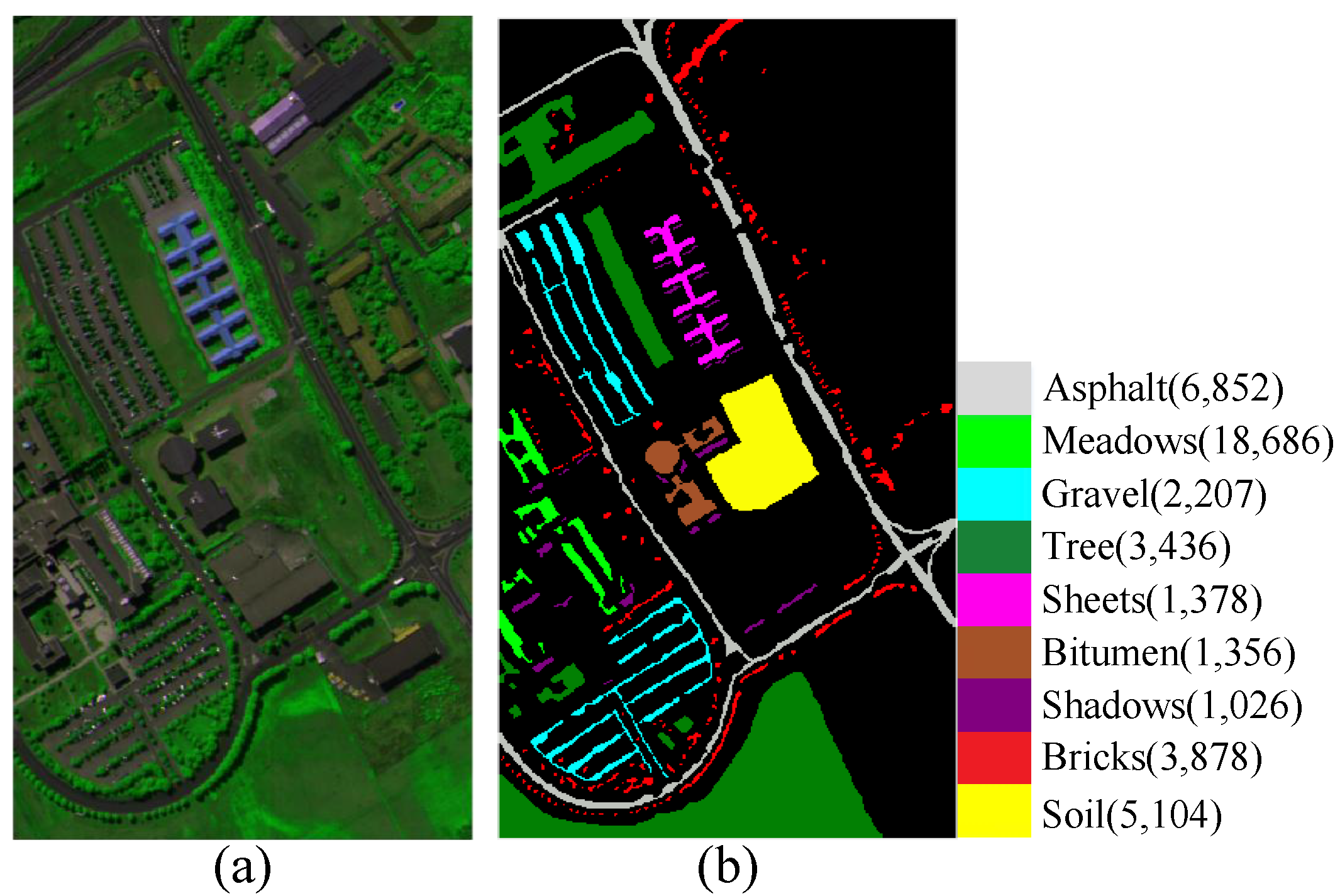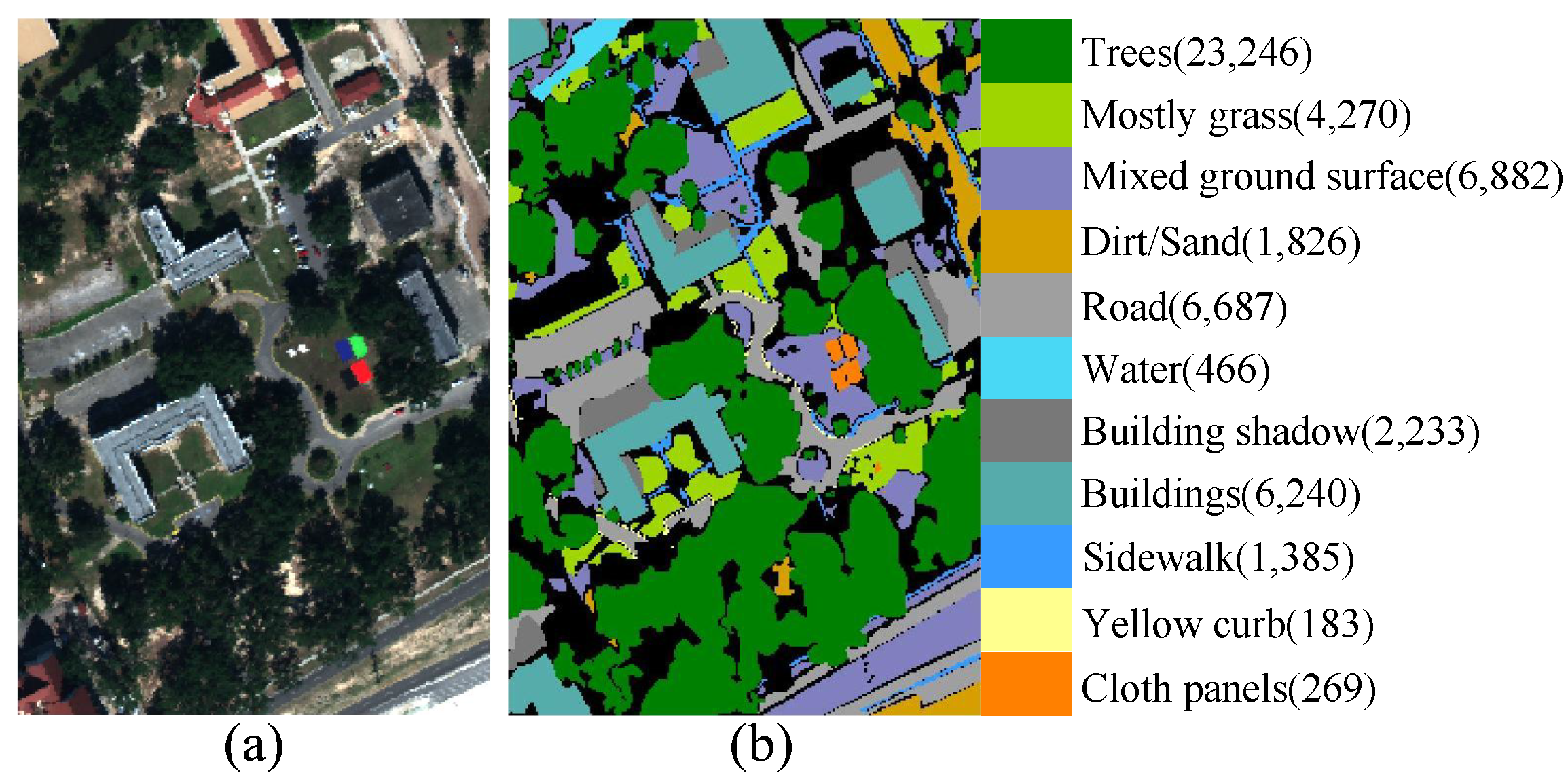 - Gader, P.; Zare, A.; Close, R.; Aitken, J.; Tuell, G. MUUFL Gulfport Hyperspectral and LiDAR Airborne Data Set; Tech. Rep. REP-2013-570; Dept. CISE, Univ. Florida: Gainesville, FL, USA, 2013. [Google Scholar]