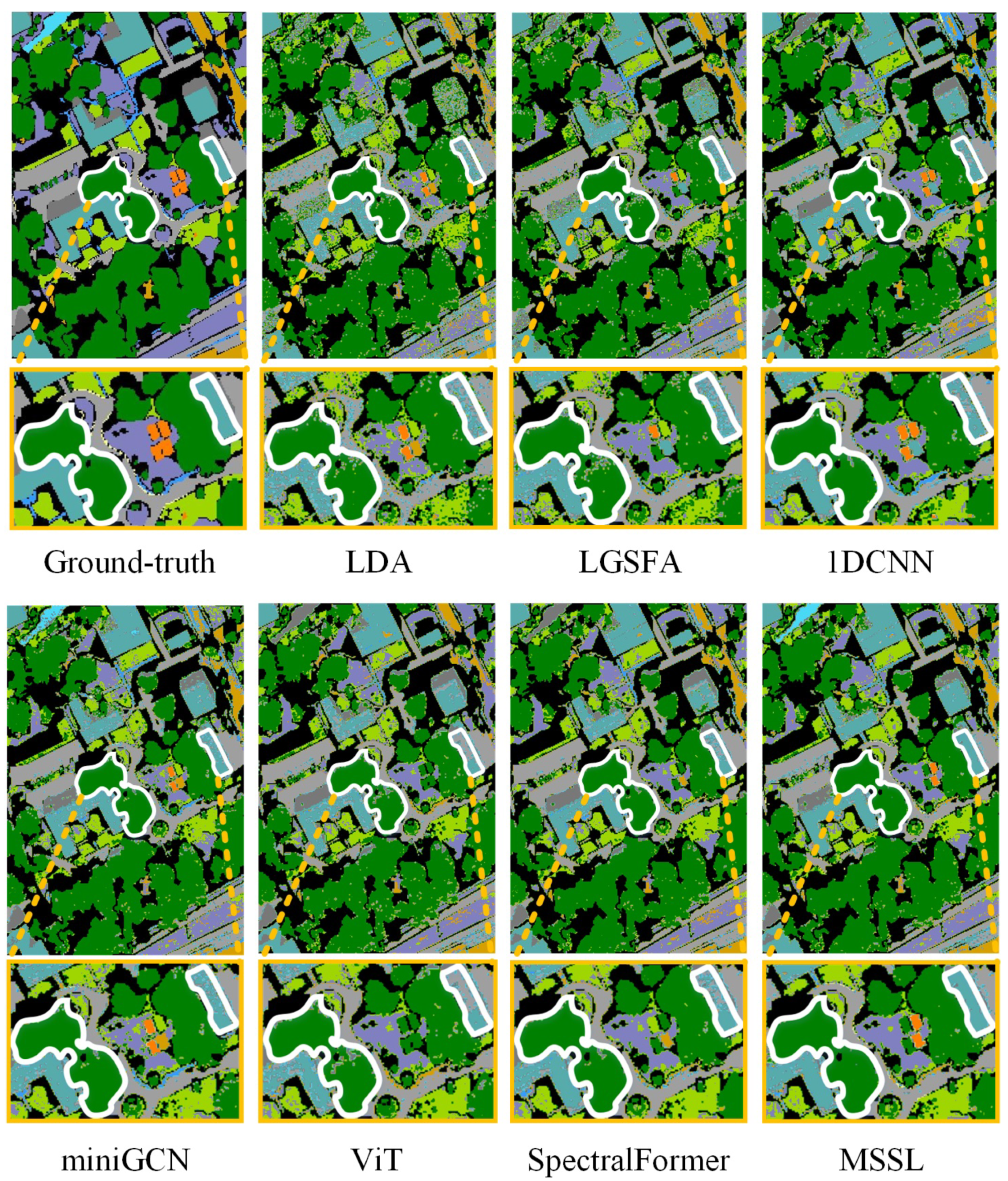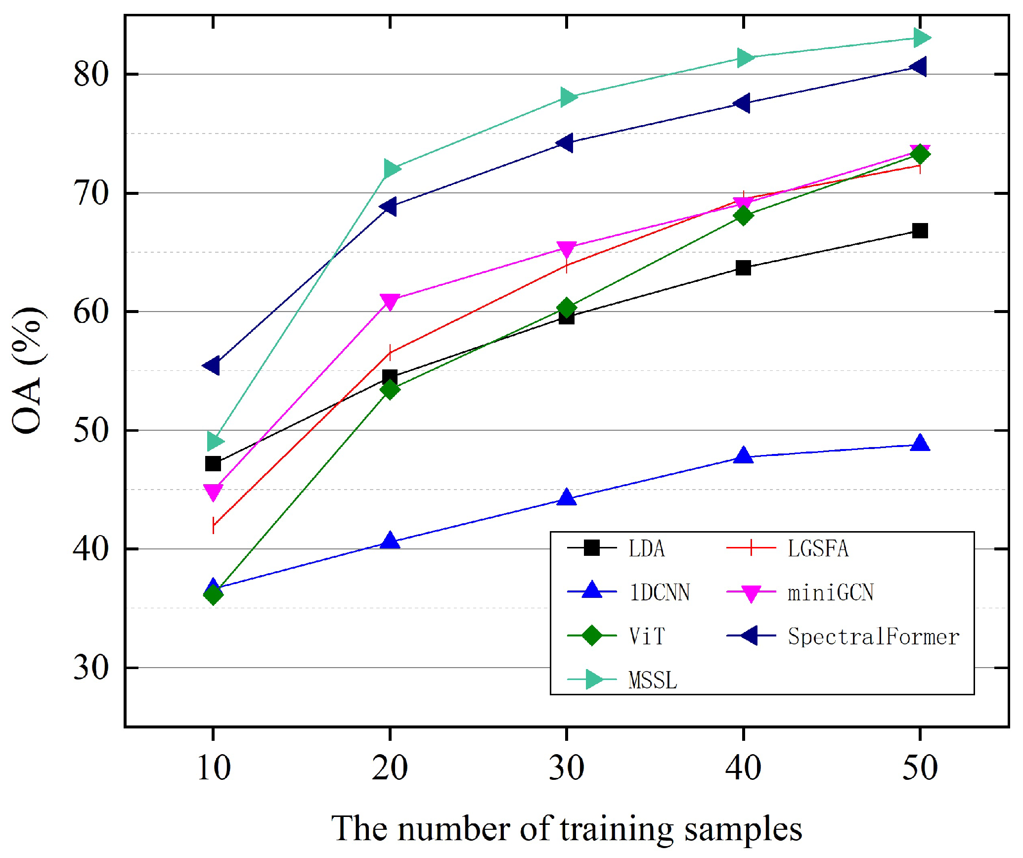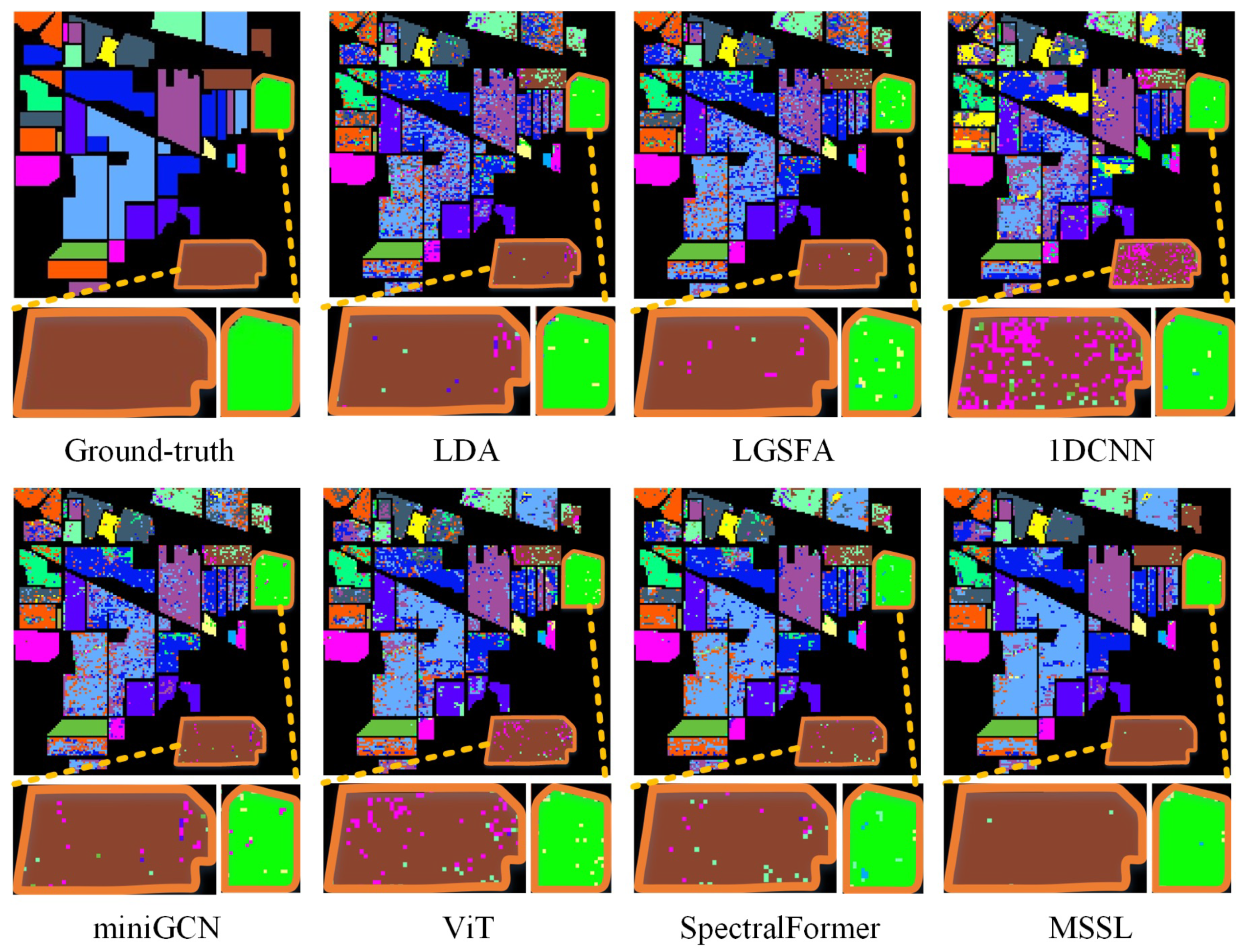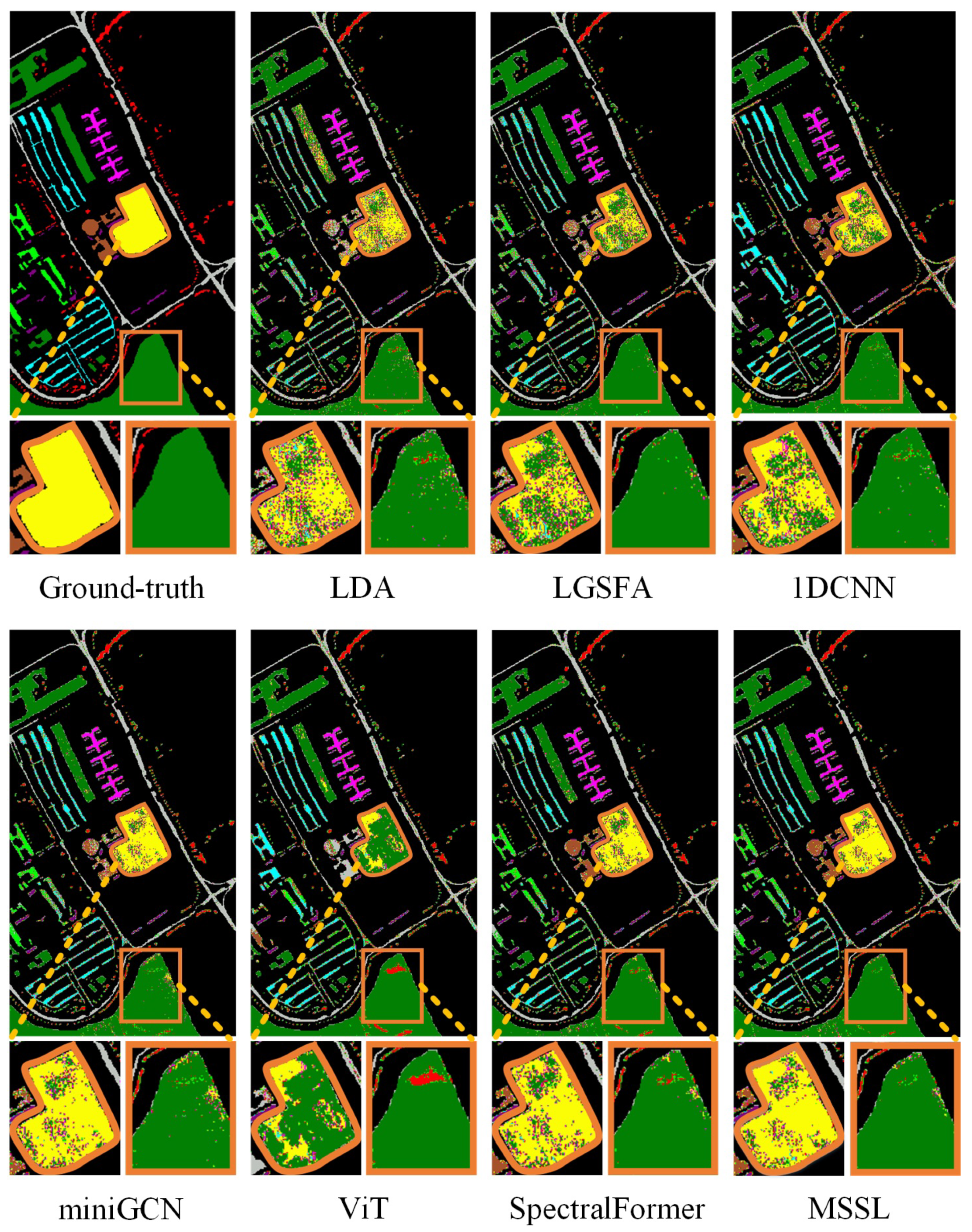 | Class | LDA | LGSFA | 1DCNN | miniGCN | ViT | SpectralFormer | MSSL |