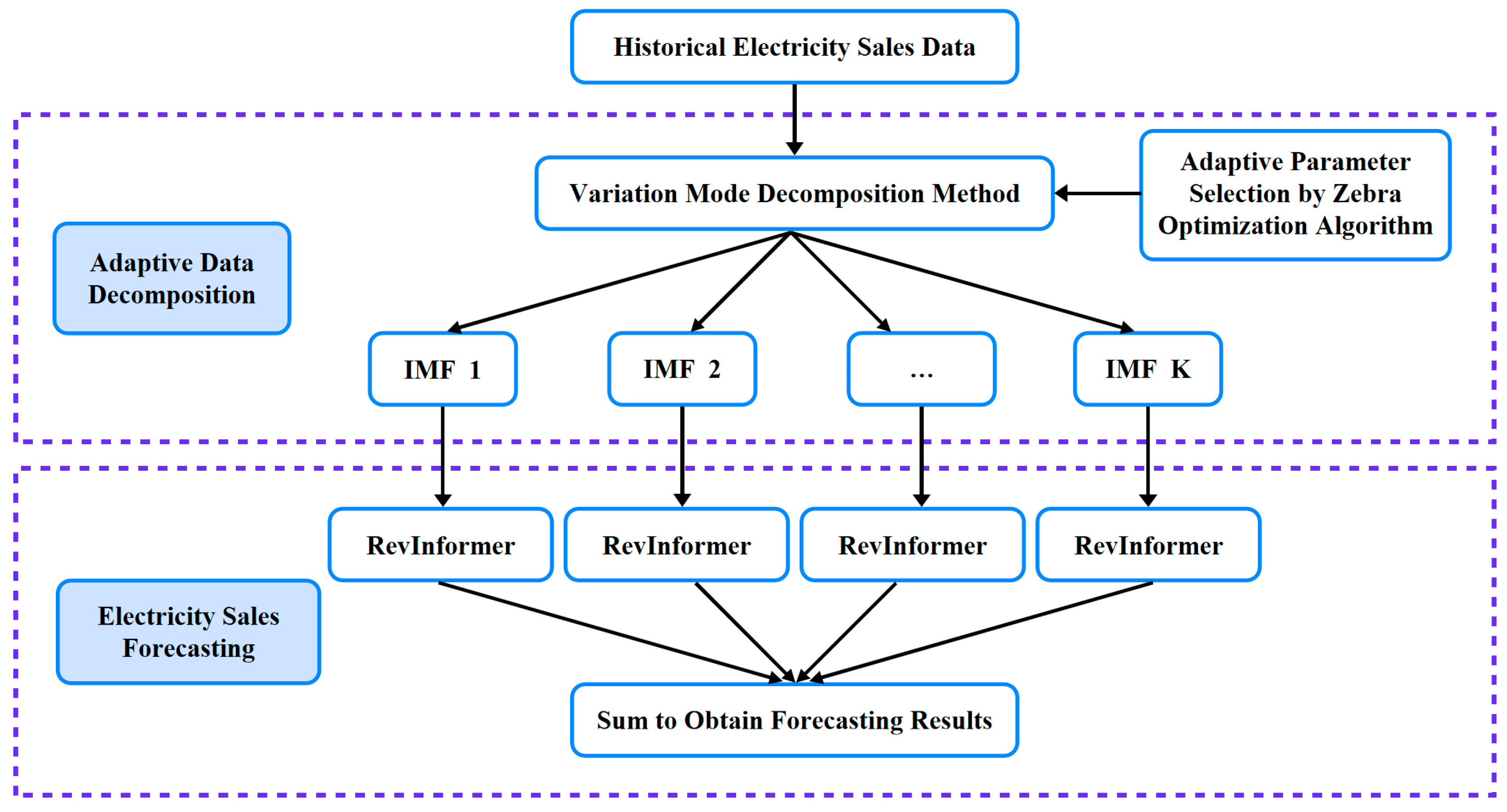 - A novel electricity sales forecasting method is proposed, employing a decomposition–integration framework. This approach adaptively decomposes the original sequence by integrating VMD with the ZOA, thus significantly reducing modeling complexity. Subsequently, an improved RevInformer model performs component-wise prediction on each subsequence, with final forecasts generated through aggregated integration of all component predictions.