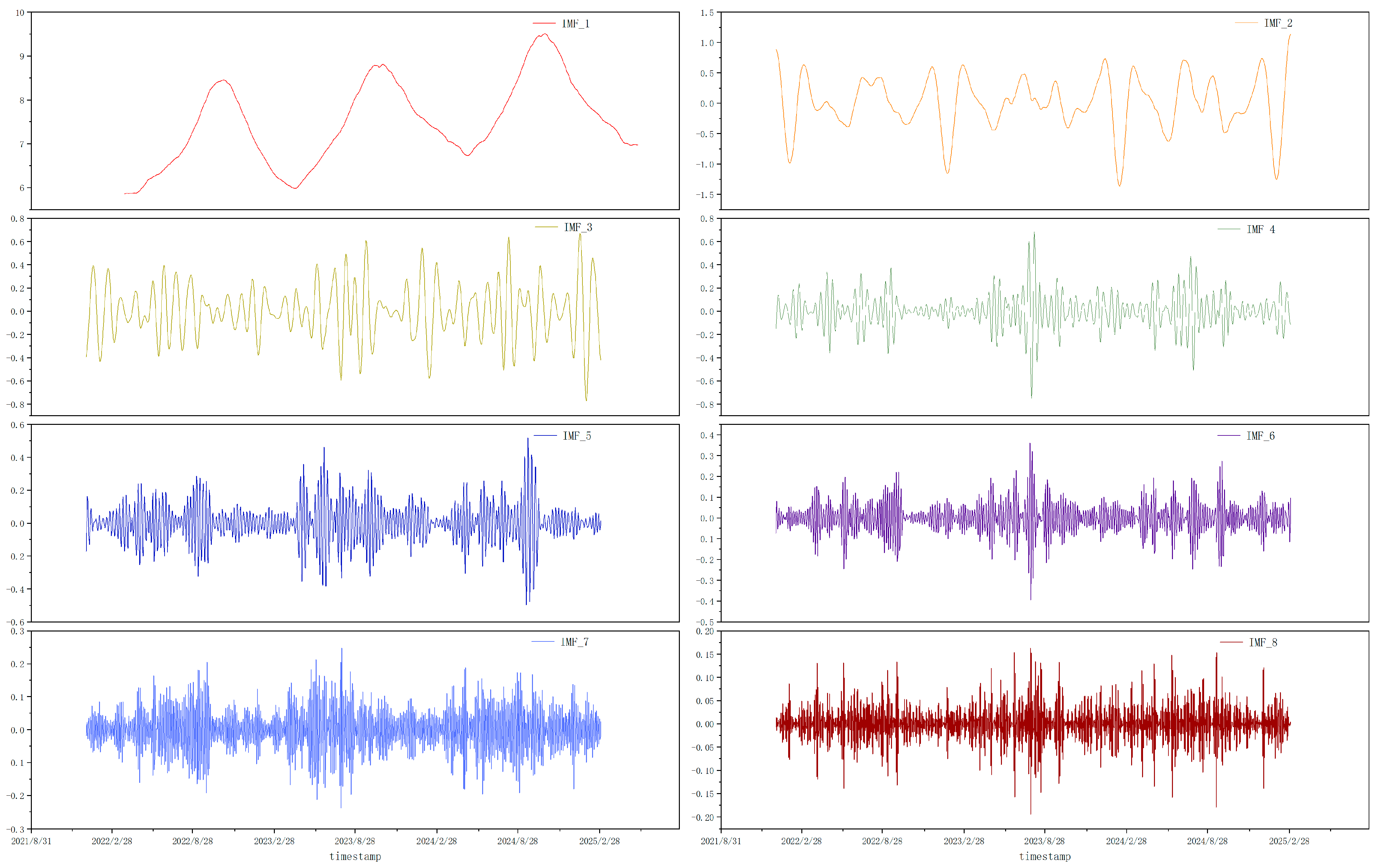- An innovative adaptive decomposition–integration forecasting framework is proposed. By integrating the ZOA with VMD, we achieved adaptive decomposition of the original series, effectively mitigating the difficulties posed by data non-stationarity and strong coupling for modeling, thereby laying a foundation for subsequent accurate predictions.