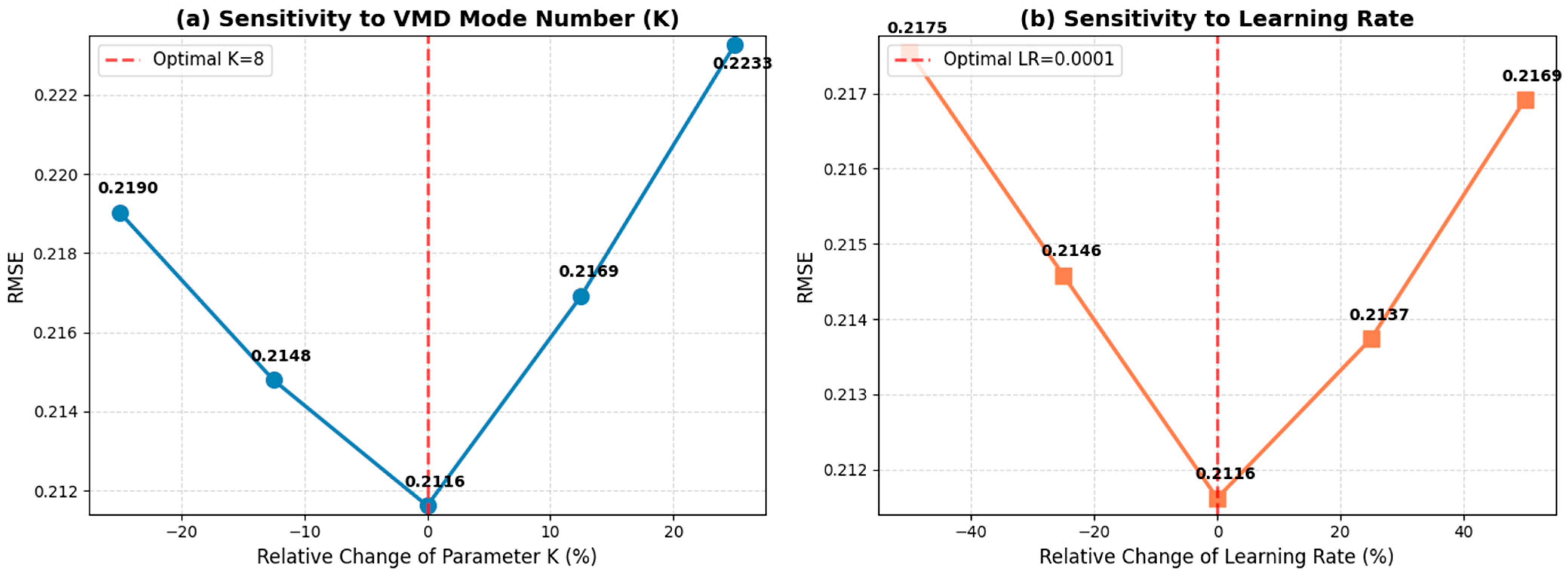 - VMD Mode Number (K): We varied K by ±1 and ±2 around the optimized value (K = 8). The resulting changes in RMSE were less than 3.5% and 6.1%, respectively.
