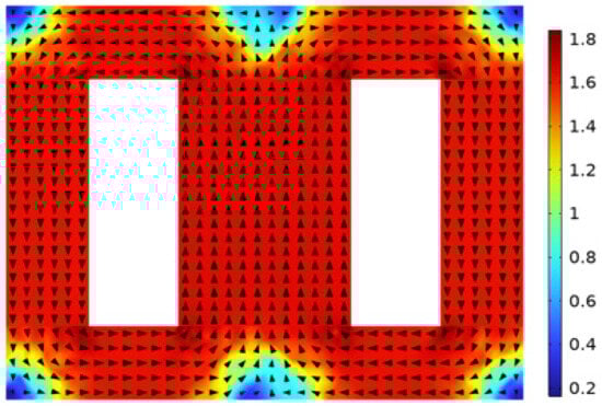 The flux density distribution of the core obtained from the field-circuit coupling calculation of the transformer is shown in Figure 6. The three core legs, from left to right, are the auxiliary limb, the core limb, and the other auxiliary limb. After the magnetic field lines flow out from the central core, they split and flow to the two auxiliary limbs. Then, they converge back to the core limb through the two auxiliary limbs, forming a complete closed magnetic circuit. At this time, the maximum flux density in the core magnetic circuit is mainly concentrated on the core limb and the inner corners of the core window.