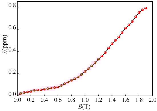 Under no-load conditions, the vibration of the transformer’s core mainly comes from the magnetostrictive effect of the silicon steel sheets. Therefore, this paper conducted a simulation analysis of the vibration under no-load conditions. A sequential coupling calculation method is adopted, that is, the electromagnetic field simulation results are transferred to the structural field. The magneto–mechanical coupling is achieved through the magnetostriction curve. In the structural field, the core is loaded in the form of strain. The magnetostriction curve is shown in Figure 7. At the same time, a fixed constraint is applied to the bottom of the core to simulate the actual state.