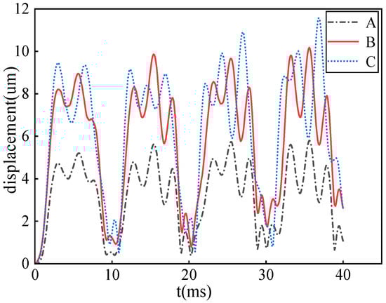 As can be seen from Figure 10, the vibration displacement variation waveform of the core caused by the magnetostrictive effect is obviously periodic, which is consistent with the theoretical formula mentioned above. The vibration of the core varies at different positions. The displacement amplitude of point A is significantly smaller than that of the other two points, and the waveforms at positions A and B basically only differ in magnitude. This is because the magnetic field directions at these two points are the same, resulting in similar magnetostrictive displacement waveforms. However, point A is closer to the fixed position at the bottom, so the vibration amplitude is smaller. Compared with point B, the waveform of point C fluctuates more. This may be because there is local saturation distortion of the magnetic flux density at the corner position, which increases the magnetostrictive effect of the core and further intensifies the vibration at the local position.