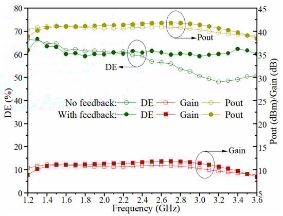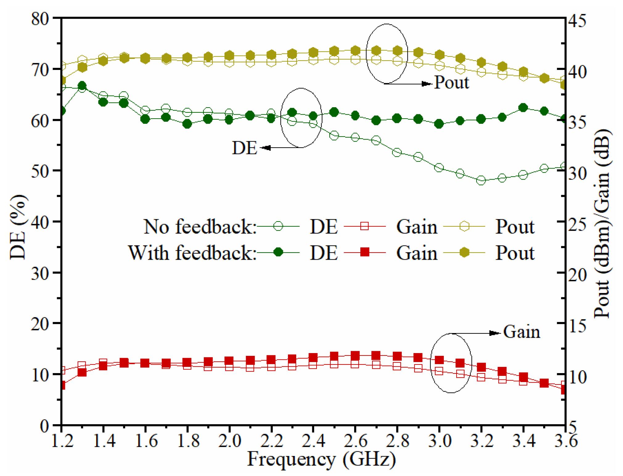 - Qi, C.; Luo, Y.; Feng, X.; Dong, C. 1.6–2.6 GHz continuous Class-F power amplifier with gain and power-added efficiency flatness enhancement by negative feedback structure. Microw. Opt. Technol. Lett. 2019, 61, 1716–1722. [Google Scholar] [CrossRef]