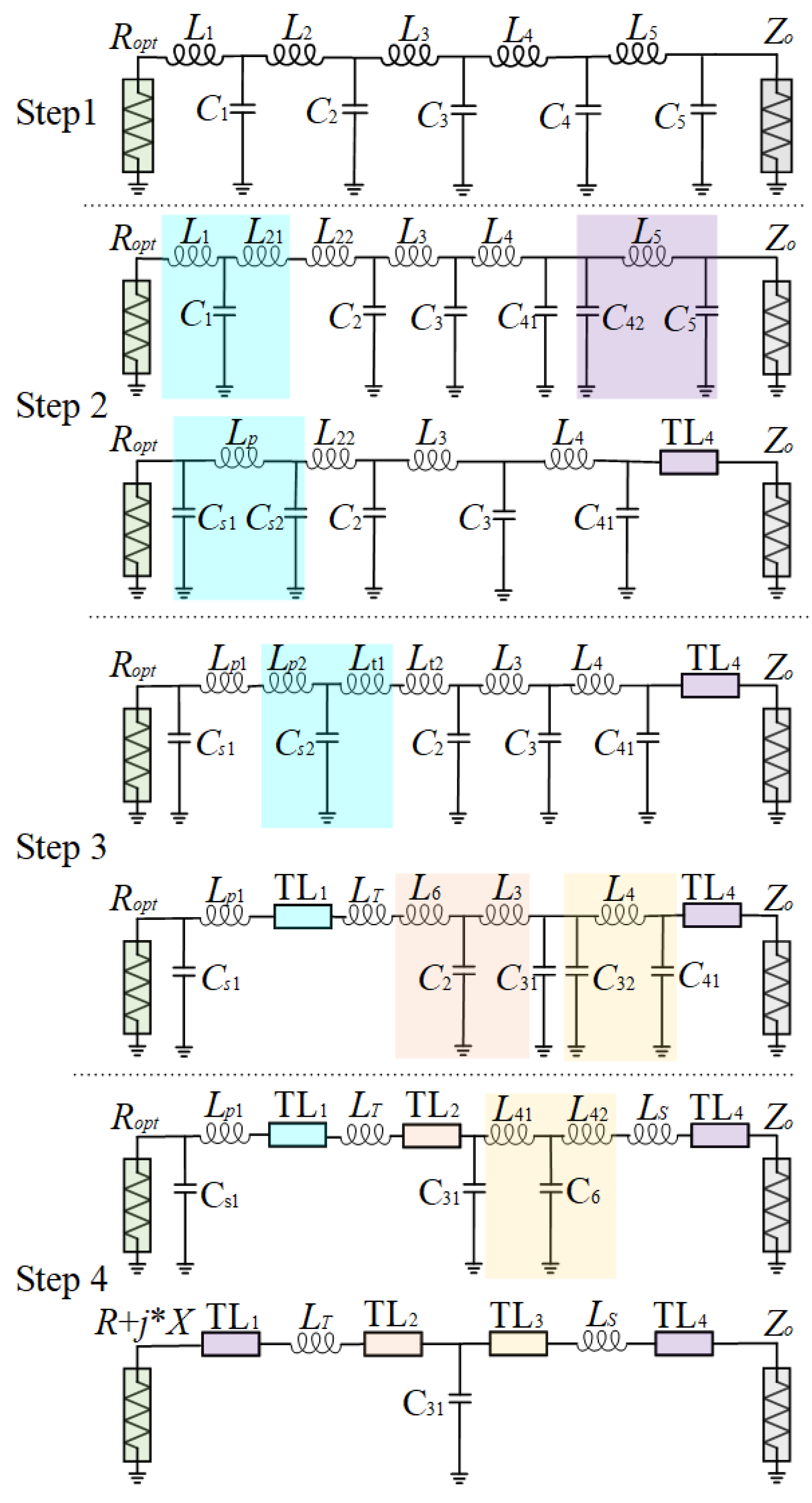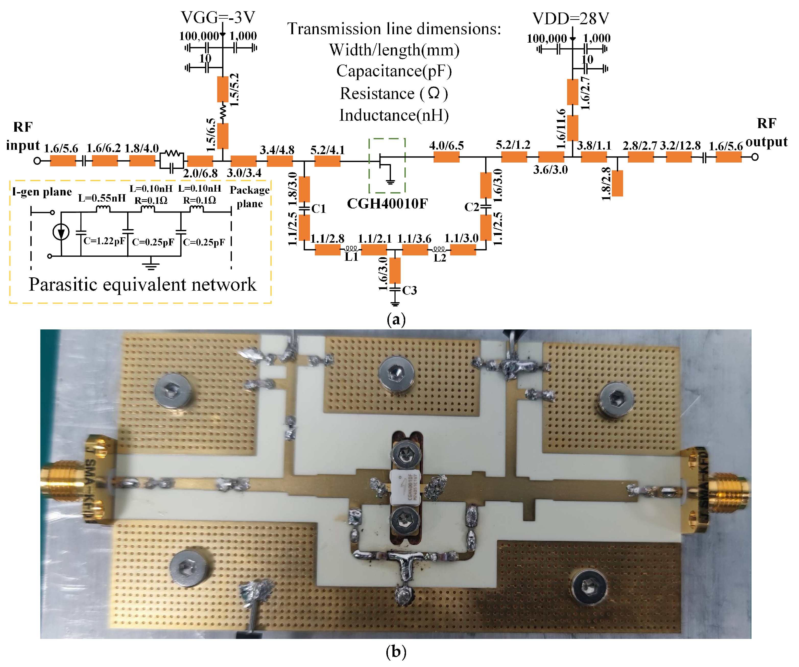 - Cong, M.; Dai, T.; Yang, Y.; Ren, J.; Zhao, F. Ultra-wideband GaN RF Power Amplifier Based on Low-pass Ladder Matching Network. IEICE Electron. Express 2024, 21, 20240486. [Google Scholar] [CrossRef]
