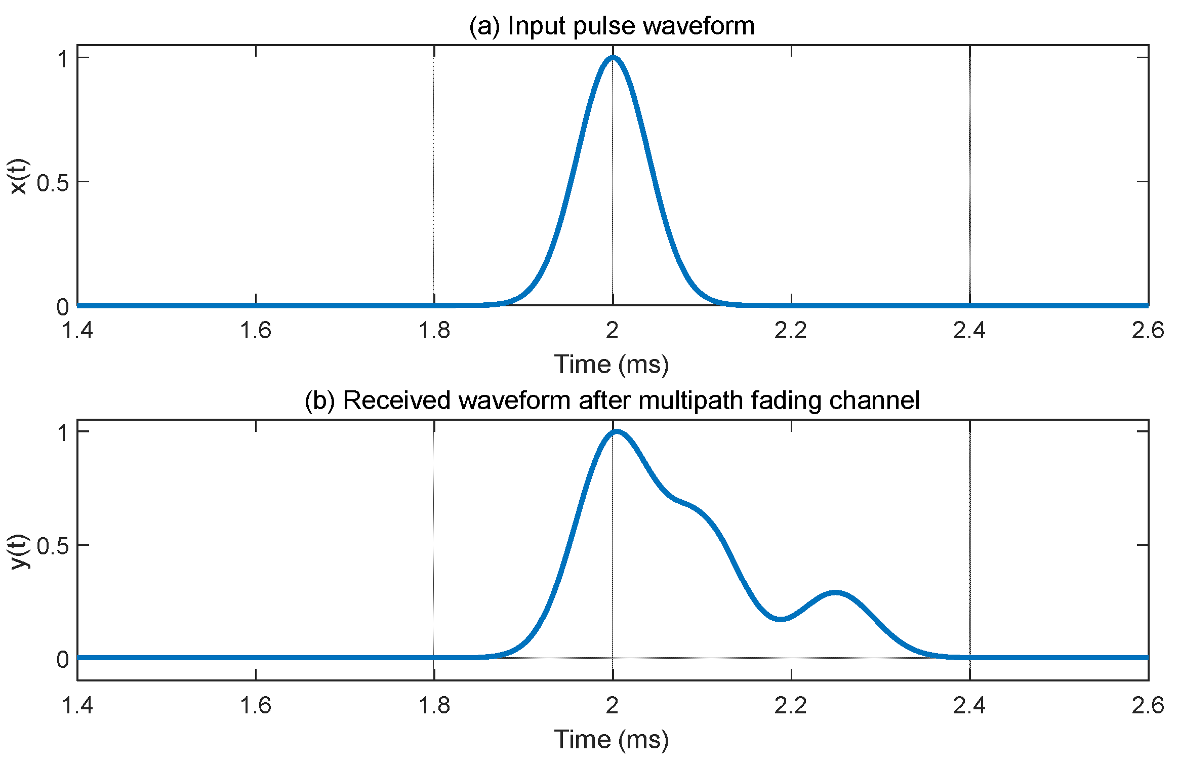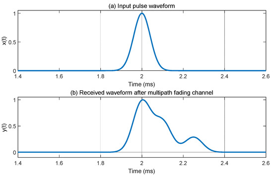 Figure 3. It can be seen that the multipath effect in the channel causes the originally steep pulse waveform to have obvious time-domain expansion and tailing effects, and the amplitude also undergoes deep random fading, which is manifested as the expansion of the jamming signal in time. This indicates that in scenarios with channel fading, if the anti-jamming decision-making method based on static assumptions is still adopted, there will be problems such as an increase in the probability of anti-jamming decision-making errors and a decrease in spectral utilization due to false alarms or missed detections of jamming.