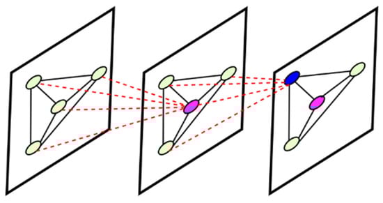 In this context, represents the Euclidean distance between vehicle and vehicle at time , where and denote the position coordinates of vehicle and vehicle , respectively, and is a small constant used to prevent division-by-zero errors. Additionally, to ensure that each vehicle node can not only interact with other nodes but also provide self-feedback, the identity matrix is added to the adjacency matrix . Thus, the model can model the self-influence of each node’s historical state and retain the node’s self-information during subsequent graph propagation, resulting in the updated adjacency matrix .