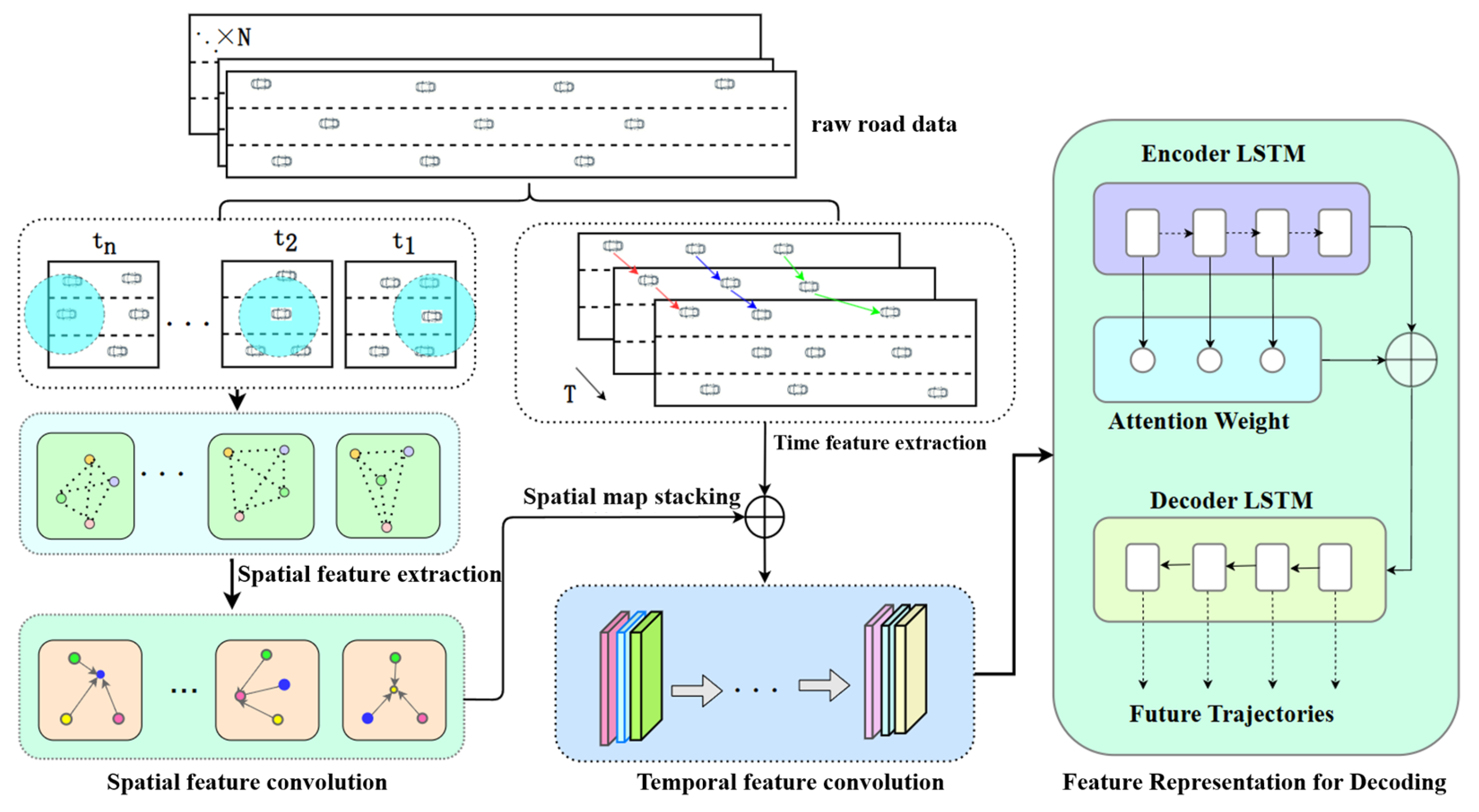 - Complex spatio-temporal coupling: The behavior of vehicles is influenced by both temporal and spatial factors, and interaction patterns vary significantly across different time points. For instance, Gao et al. [16] demonstrated that integrating spatial and temporal features with graph attention networks can improve vehicle trajectory prediction in urban traffic scenes. However, their design still relies on a relatively fixed way of combining spatial relationships and temporal evolution, which makes it difficult to fully capture highly dynamic and fine-grained spatio-temporal coupling patterns in dense traffic. Existing independent modeling methods face challenges in effectively capturing the spatio-temporal coupling, resulting in inconsistent prediction outcomes.